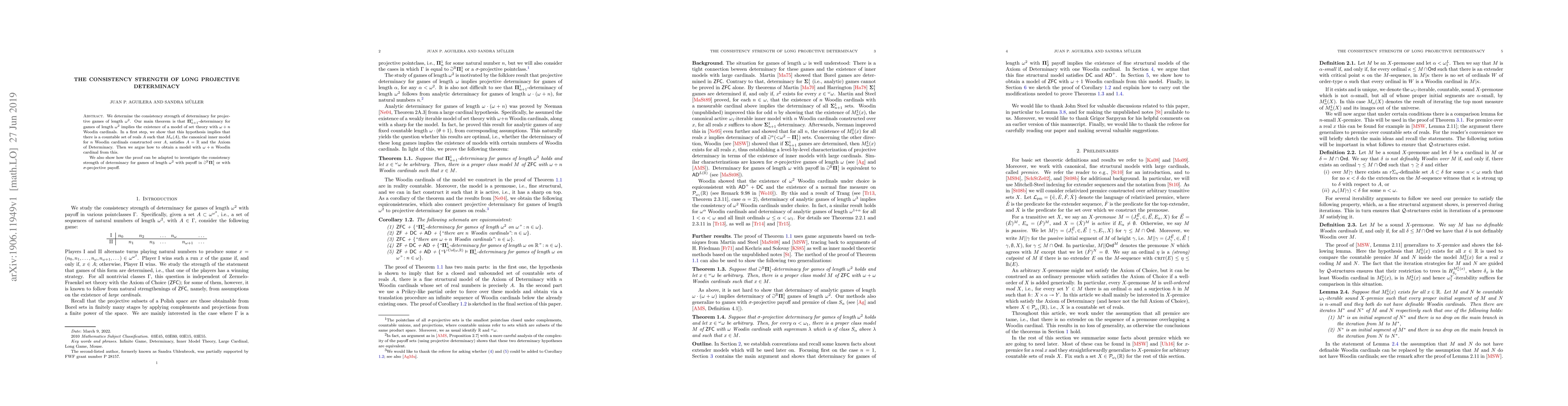 This paper investigates the consistency strength of determinacy for projective games of length $\omega^2$, proving that $\boldsymbol\Pi^1_{n+1}$-determinacy implies the existence of a model of set theory with $\omega + n$ Woodin cardinals. It also adapts the proof to handle games with $\sigma$-projective payoff.