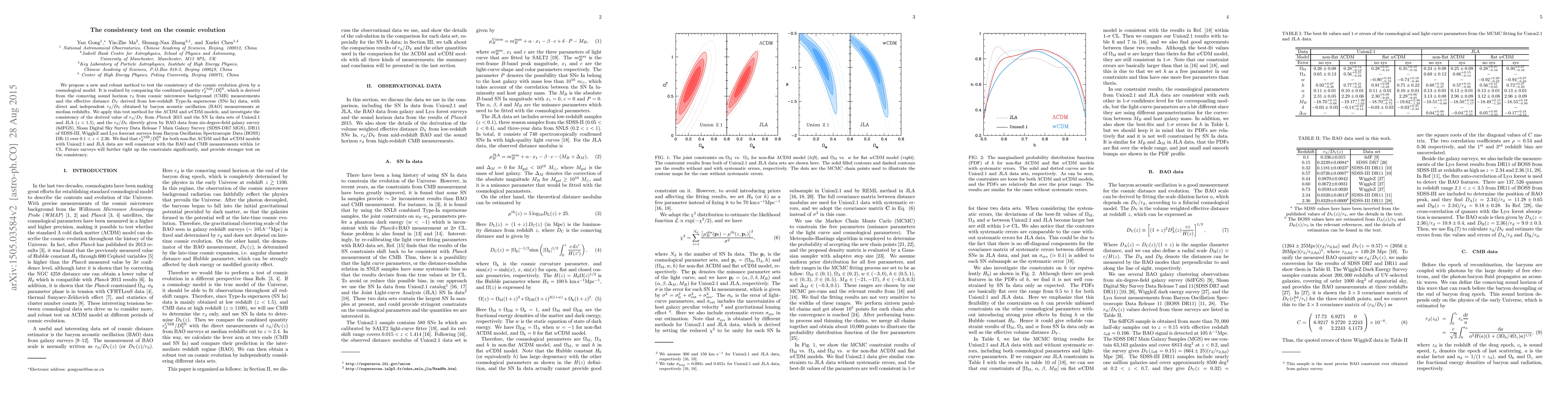Researchers developed a method to test cosmic evolution consistency using CMB, SN Ia, and BAO data, finding good agreement between models for both flat and non-flat Lambda-CDM and wCDM models.