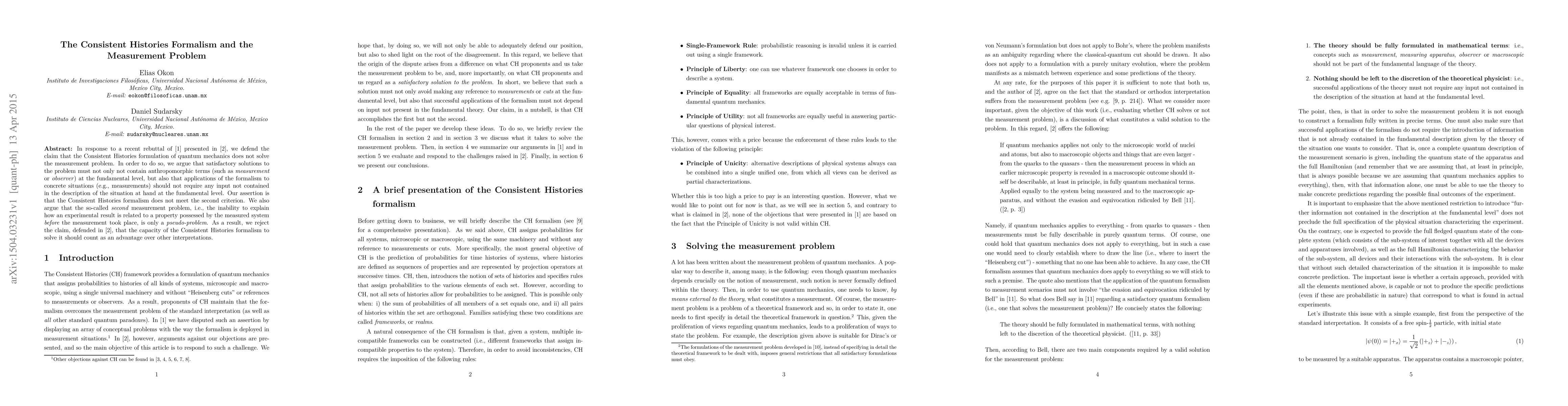 In response to a recent rebuttal of [1] presented in [2], we defend the claim that the Consistent Histories formulation of quantum mechanics does not solve the measurement problem. In order to do so, we argue that satisfactory solutions to the problem must not only not contain anthropomorphic terms (such as measurement or observer) at the fundamental level, but also that applications of the formalism to concrete situations (e.g., measurements) should not require any input not contained in the description of the situation at hand at the fundamental level. Our assertion is that the Consistent Histories formalism does not meet the second criterion. We also argue that the so-called second measurement problem, i.e., the inability to explain how an experimental result is related to a property possessed by the measured system before the measurement took place, is only a pseudo-problem. As a result, we reject the claim, defended in [2], that the capacity of the Consistent Histories formalism to solve it should count as an advantage over other interpretations.