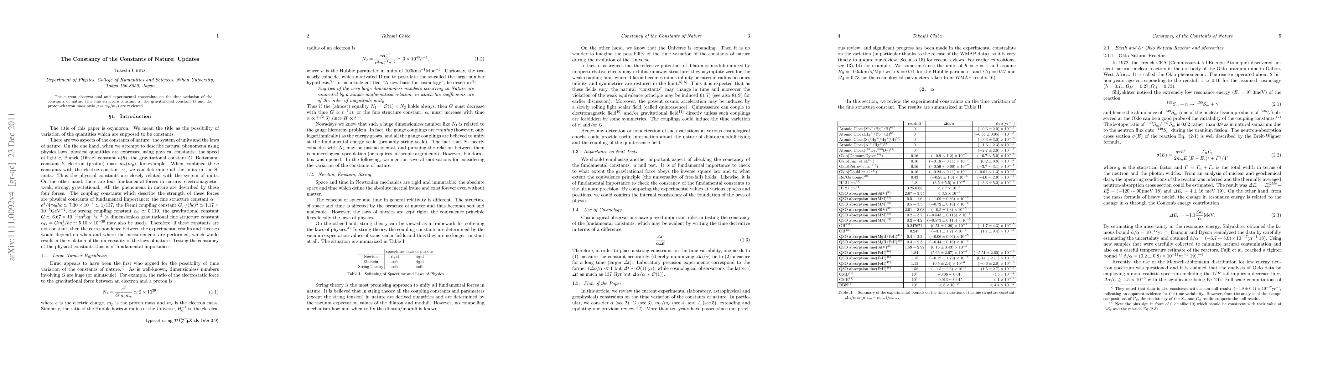 The current observational and experimental bounds on the time variation of the constants of nature (the fine structure constant $\alpha$, the gravitational constant $G$ and the proton-electron mass ratio $\mu=m_p/m_e$) are reviewed.