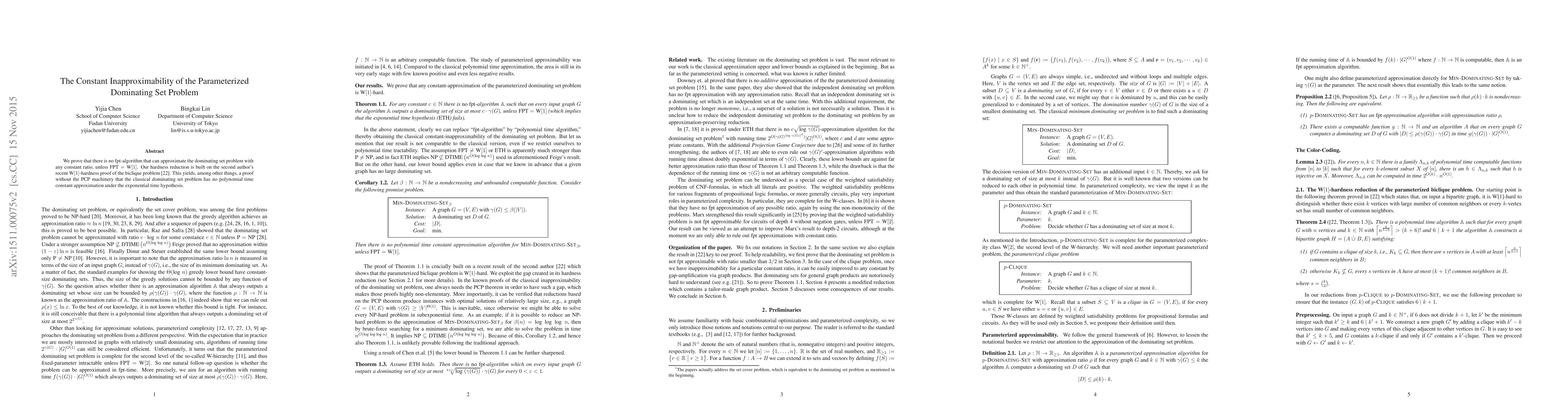 This paper demonstrates the impossibility of approximating the Dominating Set problem with a constant factor using fixed-parameter tractable (fpt) algorithms, unless FPT equals W[1]. It leverages a reduction from the W[1]-hard biclique problem to establish this result, thereby proving that the classical Dominating Set problem lacks polynomial time constant approximation under the exponential time hypothesis.