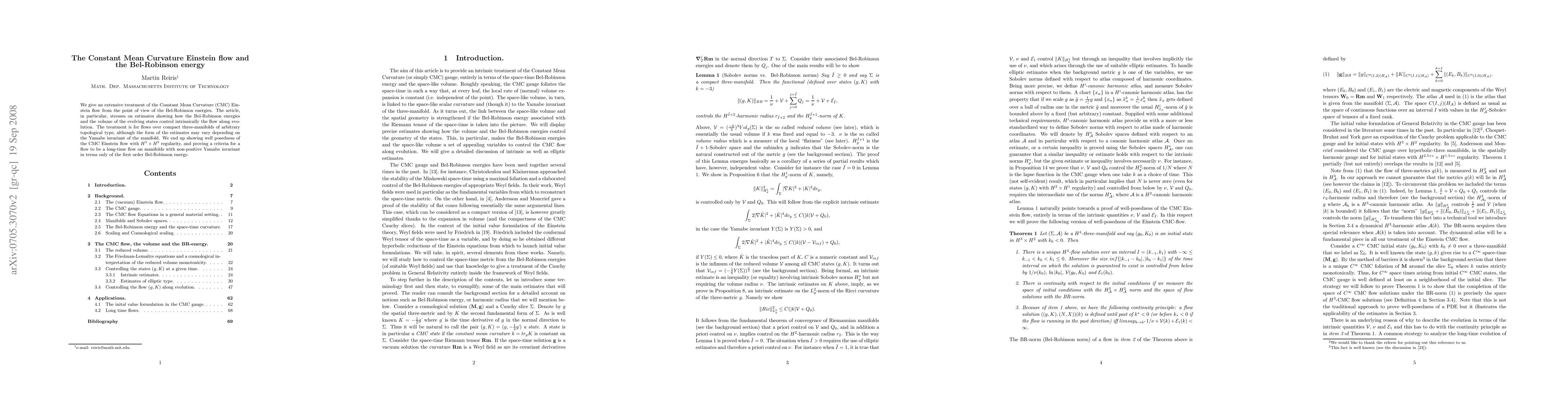 This paper investigates the Constant Mean Curvature Einstein flow, emphasizing the role of Bel-Robinson energies in controlling the flow's evolution. It demonstrates well-posedness and provides criteria for long-time existence based on first-order Bel-Robinson energy, particularly for manifolds with non-positive Yamabe invariant.