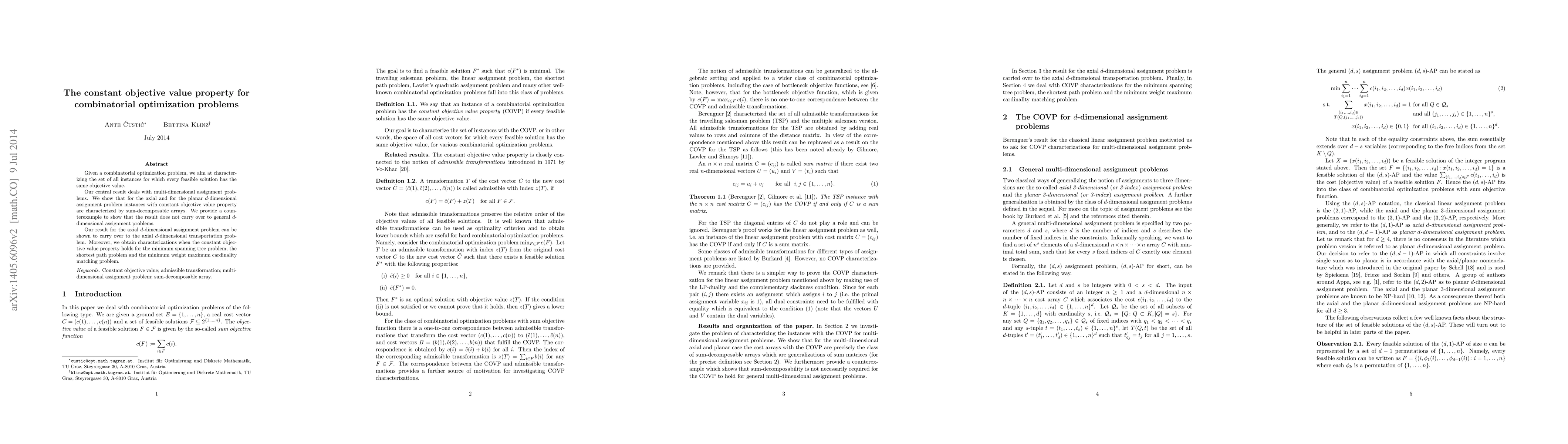 This paper characterizes instances of combinatorial optimization problems where all feasible solutions share the same objective value, focusing on multi-dimensional assignment problems. It demonstrates that axial and planar $d$-dimensional assignment problems with this property are sum-decomposable, while providing counterexamples for general $d$-dimensional assignments. The findings extend to axial $d$-dimensional transportation problems and several other specific optimization problems.