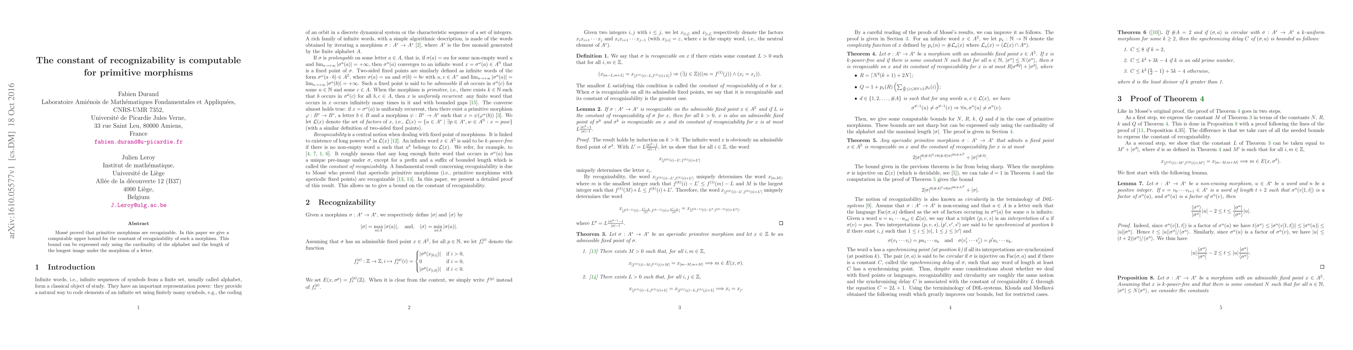This paper presents a computable upper bound for the recognizability constant of primitive morphisms, a concept from formal language theory, using only the alphabet size and the length of the longest image of a letter under the morphism.