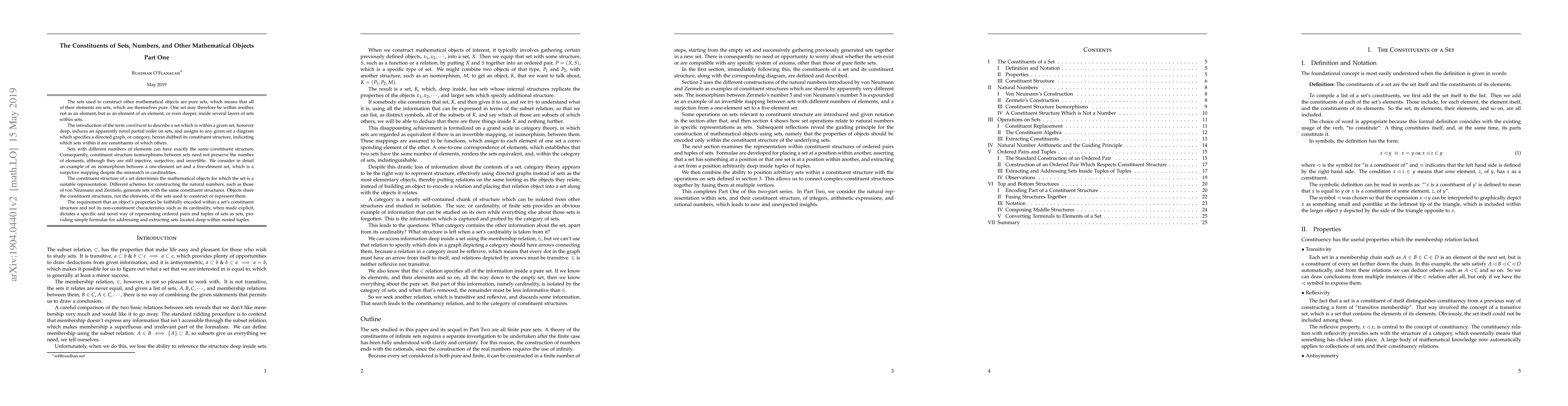 The sets used to construct other mathematical objects are pure sets, which means that all of their elements are sets, which are themselves pure. One set may therefore be within another, not as an element, but as an element of an element, or even deeper, inside several layers of sets within sets. The introduction of the term constituent to describe a set which is within a given set, however deep, induces an apparently novel partial order on sets, and assigns to any given set a diagram which specifies a directed graph, or category, herein dubbed its constituent structure, indicating which sets within it are constituents of which others. Sets with different numbers of elements can have exactly the same constituent structure. Consequently, constituent structure isomorphisms between sets need not preserve the number of elements, although they are still injective, surjective, and invertible. We consider in detail an example of an isomorphism between a one-element set and a five-element set, which is a surjective mapping despite the mismatch in cardinalities. The constituent structure of a set determines the mathematical objects for which the set is a suitable representation. Different schemes for constructing the natural numbers, such as those of von Neumann and Zermelo, generate sets with the same constituent structures. Objects share the constituent structures, not the elements, of the sets used to construct or represent them. The requirement that an object's properties be faithfully encoded within a set's constituent structure and not its non-constituent characteristics such as its cardinality, when made explicit, dictates a specific and novel way of representing ordered pairs and tuples of sets as sets, providing simple formulae for addressing and extracting sets located deep within nested tuples.