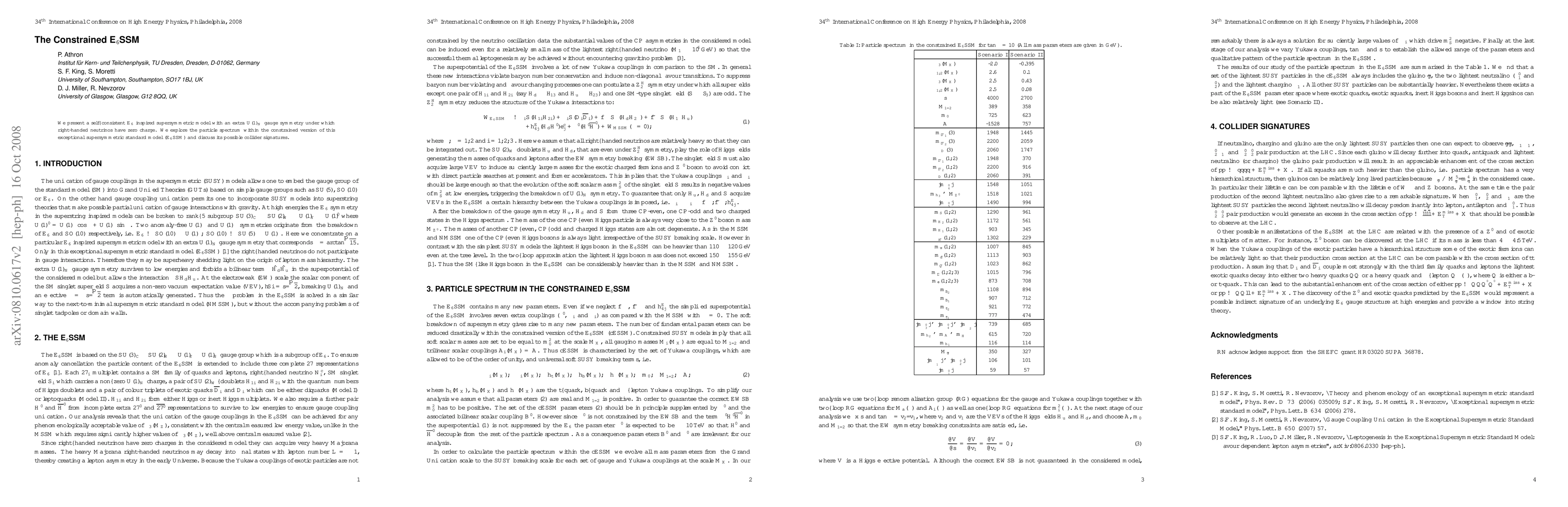 We present a self--consistent $E_6$ inspired supersymmetric model with an extra $U(1)_{N}$ gauge symmetry under which right-handed neutrinos have zero charge. We explore the particle spectrum within the constrained version of this exceptional supersymmetric standard model (E$_6$SSM) and discuss its possible collider signatures.