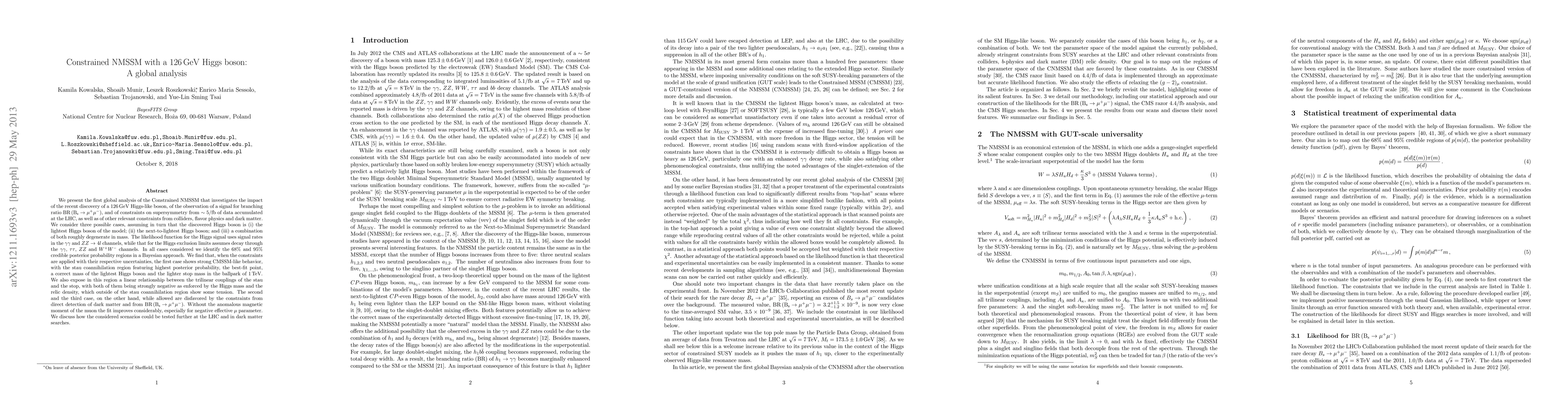 We present the first global analysis of the Constrained NMSSM that investigates the impact of the recent discovery of a 126 GeV Higgs-like boson, of the observation of a signal for BR(B_s->\mu^+\mu^-), and of constraints on supersymmetry from ~5/fb of data accumulated at the LHC, as well as of other relevant constraints from colliders, flavor physics and dark matter. We consider three possible cases, assuming in turn that the discovered Higgs boson is: i) the lightest Higgs boson of the model; ii) the next-to-lightest Higgs boson; and iii) a combination of both roughly degenerate in mass. The likelihood function for the Higgs signal uses signal rates in the \gamma\gamma\ and ZZ --> 4l channels, while that for the Higgs exclusion limits assumes decay through the \gamma\gamma, \tau\tau, ZZ and W^+W^- channels. In all cases considered we identify the 68% and 95% credible posterior probability regions in a Bayesian approach. We find that, when the constraints are applied with their respective uncertainties, the first case shows strong CMSSM-like behavior, with the stau coannihilation region featuring highest posterior probability, the best-fit point, a correct mass of the lightest Higgs boson and the lighter stop mass in the ballpark of 1 TeV. The second and the third cases, on the other hand, while allowed are disfavored by the constraints from direct detection of dark matter and from BR(B_s->\mu^+\mu^-). Without the anomalous magnetic moment of the muon the fit improves considerably, especially for negative effective \mu\ parameter. We discuss how the considered scenarios could be tested furtherly at the LHC and in dark matter searches.