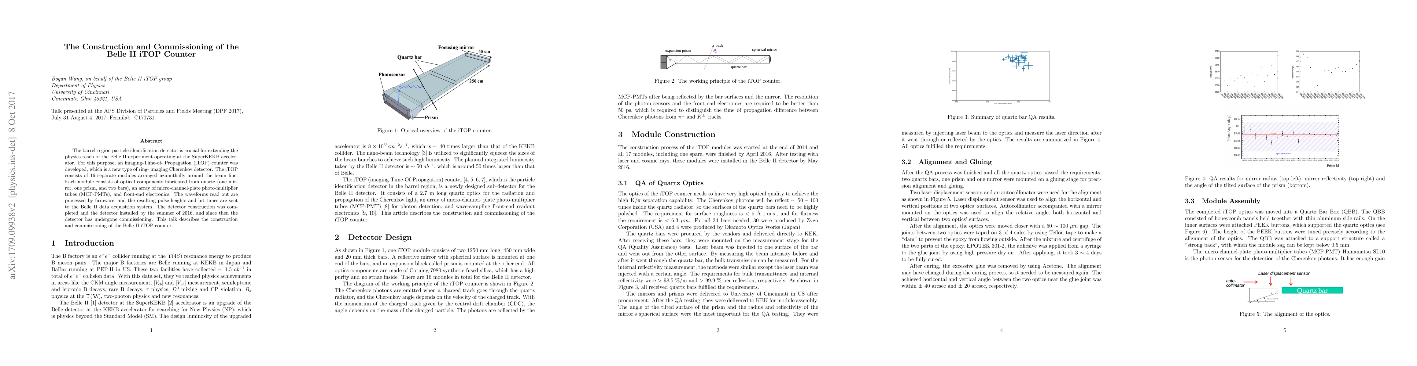 The barrel-region particle identification detector is crucial for extending the physics reach of the Belle II experiment operating at the SuperKEKB accelerator. For this purpose, an imaging-Time-of-Propagation (iTOP) counter was developed, which is a new type of ring-imaging Cherenkov detector. The iTOP consists of 16 separate modules arranged azimuthally around the beam line. Each module consists of optical components fabricated from quartz (one mirror, one prism, and two bars), an array of micro-channel-plate photo-multiplier tubes (MCP-PMTs), and front-end electronics. The waveforms read out are processed by firmware, and the resulting pulse-heights and hit times are sent to the Belle II data acquisition system. The detector construction was completed and the detector installed by the summer of 2016, and since then the detector has undergone commissioning. This talk describes the construction and commissioning of the Belle II iTOP counter.
