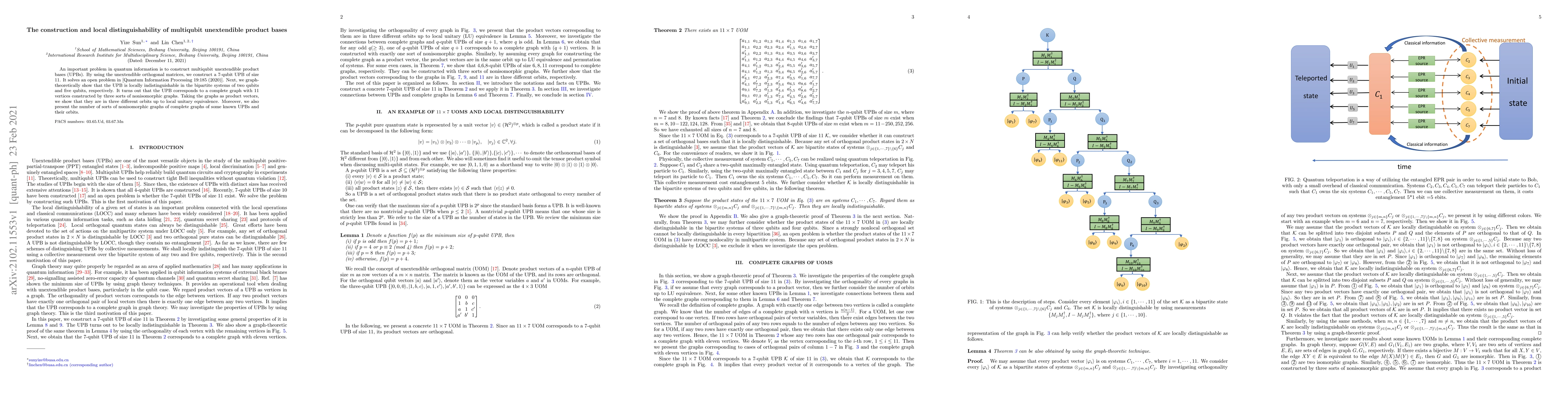 An important problem in quantum information is to construct multiqubit unextendible product bases (UPBs). By using the unextendible orthogonal matrices, we construct a 7-qubit UPB of size 11. It solves an open problem in [Quantum Information Processing 19:185 (2020)]. Next, we graph-theoretically show that the UPB is locally indistinguishable in the bipartite systems of two qubits and five qubits, respectively. It turns out that the UPB corresponds to a complete graph with 11 vertices constructed by three sorts of nonisomorphic graphs. Taking the graphs as product vectors, we show that they are in three different orbits up to local unitary equivalence. Moreover, we also present the number of sorts of nonisomorphic graphs of complete graphs of some known UPBs and their orbits.