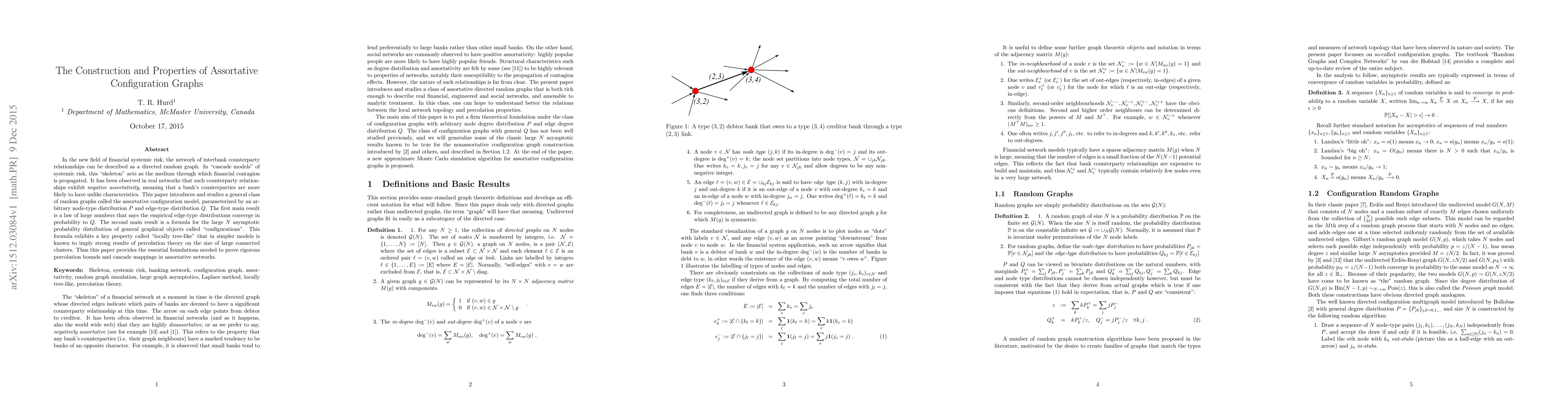 In the new field of financial systemic risk, the network of interbank counterparty relationships can be described as a directed random graph. In "cascade models" of systemic risk, this "skeleton" acts as the medium through which financial contagion is propagated. It has been observed in real networks that such counterparty relationships exhibit negative assortativity, meaning that a bank's counterparties are more likely to have unlike characteristics. This paper introduces and studies a general class of random graphs called the assortative configuration model, parameterized by an arbitrary node-type distribution P and edge-type distribution Q. The first main result is a law of large numbers that says the empirical edge-type distributions converge in probability to Q. The second main result is a formula for the large N asymptotic probability distribution of general graphical objects called "configurations". This formula exhibits a key property called "locally tree-like" that in simpler models is known to imply strong results of percolation theory on the size of large connected clusters. Thus this paper provides the essential foundations needed to prove rigorous percolation bounds and cascade mappings in assortative networks.