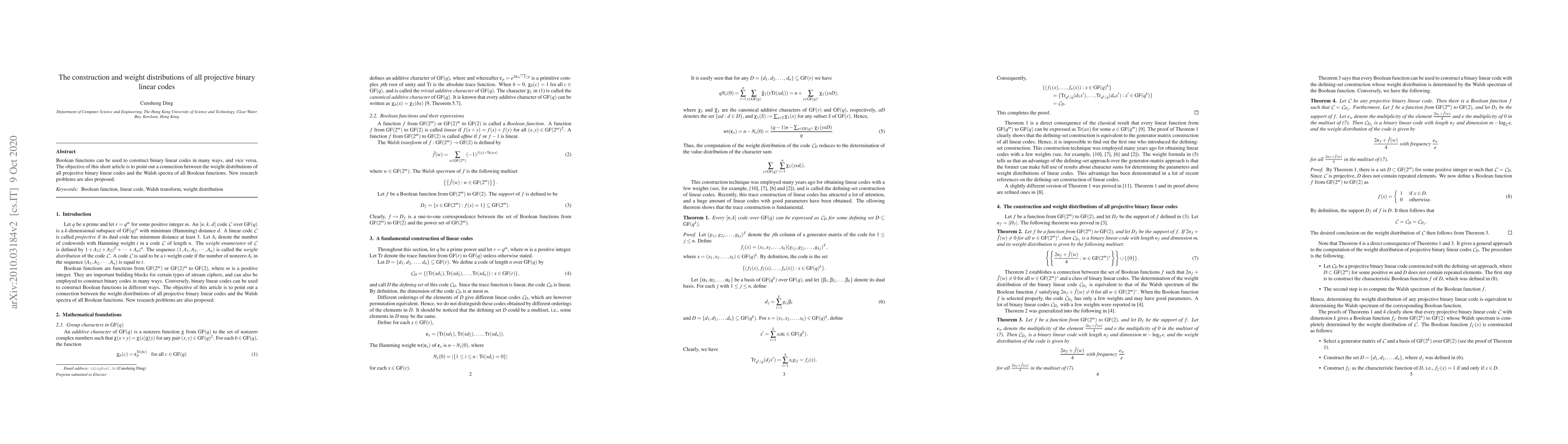 Boolean functions can be used to construct binary linear codes in many ways, and vice versa. The objective of this short article is to point out a connection between the weight distributions of all projective binary linear codes and the Walsh spectra of all Boolean functions. New research problems are also proposed.