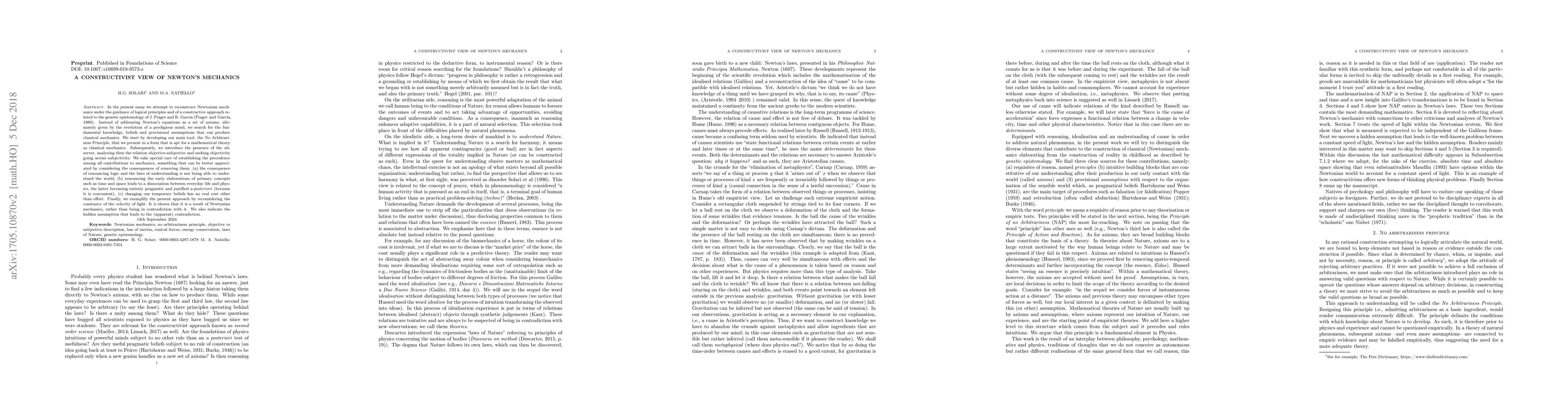 In the present essay we attempt to reconstruct Newtonian mechanics under the guidance of logical principles and of a constructive approach related to the genetic epistemology of J. Piaget and R. Garc\'ia \citep{piag89}. Instead of addressing Newton's equations as a set of axioms, ultimately given by the revelation of a prodigious mind, we search for the fundamental knowledge, beliefs and provisional assumptions that can produce classical mechanics. We start by developing our main tool: the No Arbitrariness Principle, that we present in a form that is apt for a mathematical theory as classical mechanics. Subsequently, we introduce the presence of the observer, analysing then the relation objective-subjective and seeking objectivity going across subjectivity. We take special care of establishing the precedence among all contributions to mechanics, something that can be better appreciated by considering the consequences of removing them: (a) the consequence of renouncing logic and the laws of understanding is not being able to understand the world, (b) renouncing the early elaborations of primary concepts such as time and space leads to a dissociation between everyday life and physics, the latter becoming entirely pragmatic and justified \emph{a-posteriori} (because it is convenient), (c) changing our temporary beliefs has no real cost other than effort. Finally, we exemplify the present approach by reconsidering the constancy of the velocity of light. It is shown that it is a result of Newtonian mechanics, rather than being in contradiction with it. We also indicate the hidden assumption that leads to the (apparent) contradiction.