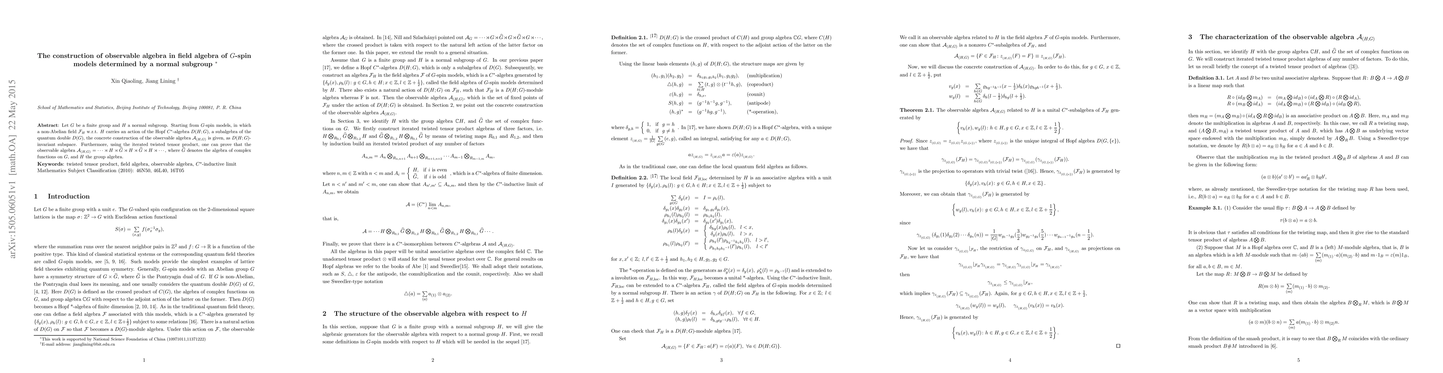 Let $G$ be a finite group and $H$ a normal subgroup. Starting from $G$-spin models, in which a non-Abelian field ${\mathcal{F}}_H$ w.r.t. $H$ carries an action of the Hopf $C^*$-algebra $D(H;G)$, a subalgebra of the quantum double $D(G)$, the concrete construction of the observable algebra ${\mathcal{A}}_{(H,G)}$ is given, as $D(H;G)$-invariant subspace. Furthermore, using the iterated twisted tensor product, one can prove that the observable algebra ${\mathcal{A}}_{(H,G)}=\cdots\rtimes H\rtimes\hat{G}\rtimes H\rtimes\hat{G}\rtimes H\rtimes\cdots$, where $\hat{G}$ denotes the algebra of complex functions on $G$, and $H$ the group algebra.