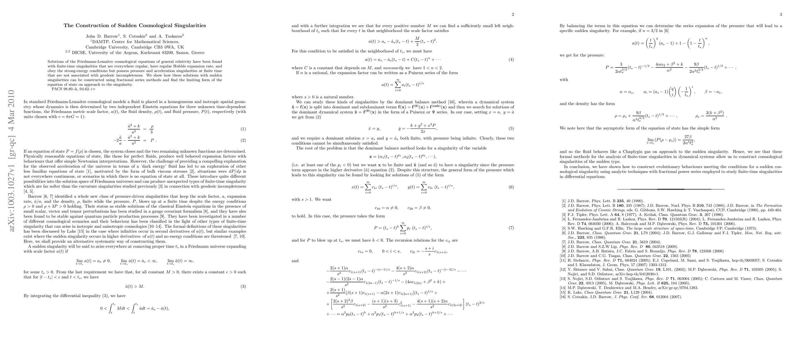 Solutions of the Friedmann-Lemaitre cosmological equations of general relativity have been found with finite-time singularities that are everywhere regular, have regular Hubble expansion rate, and obey the strong-energy conditions but possess pressure and acceleration singularities at finite time that are not associated with geodesic incompleteness. We show how these solutions with sudden singularities can be constructed using fractional series methods and find the limiting form of the equation of state on approach to the singularity.