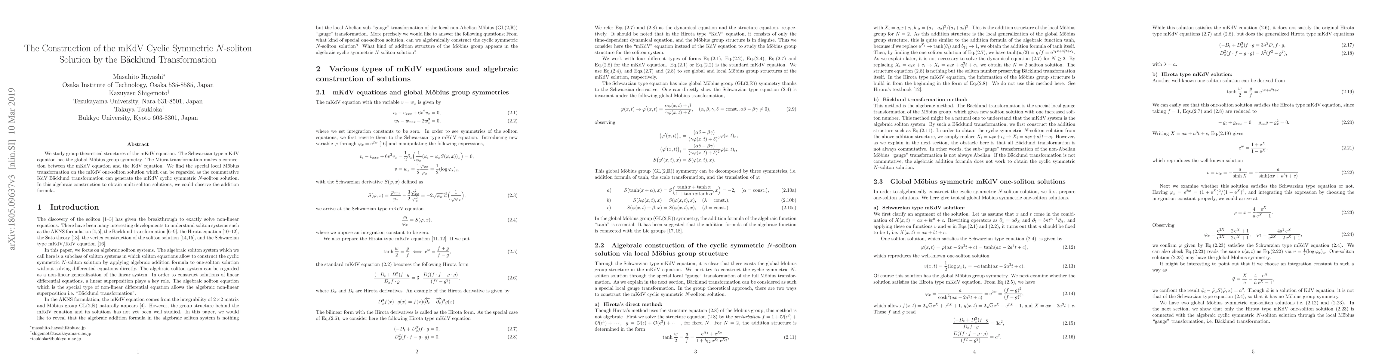 This paper explores the group theoretical structures of the modified Korteweg-de Vries (mKdV) equation, revealing its global M\"obius group symmetry and connection to the KdV equation via the Miura transformation. It introduces a special local M\"obius transformation to generate cyclic symmetric $N$-soliton solutions using the B\"acklund transformation, observing an addition formula in the process.