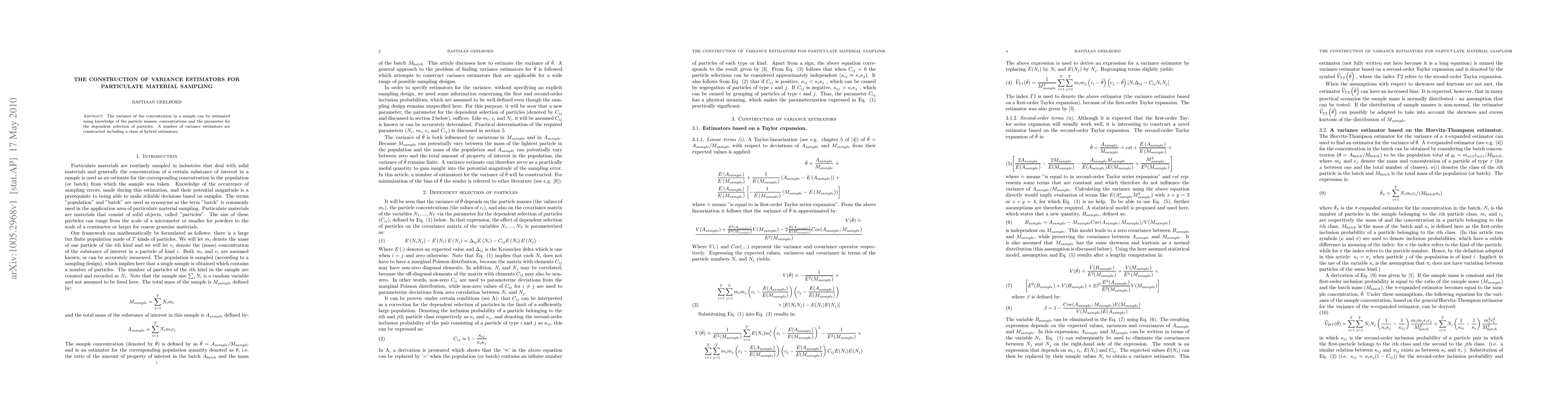 Summary: This paper develops various variance estimators for particulate material sampling, incorporating particle masses, concentrations, and selection parameters. It introduces a class of hybrid estimators to improve estimation accuracy.