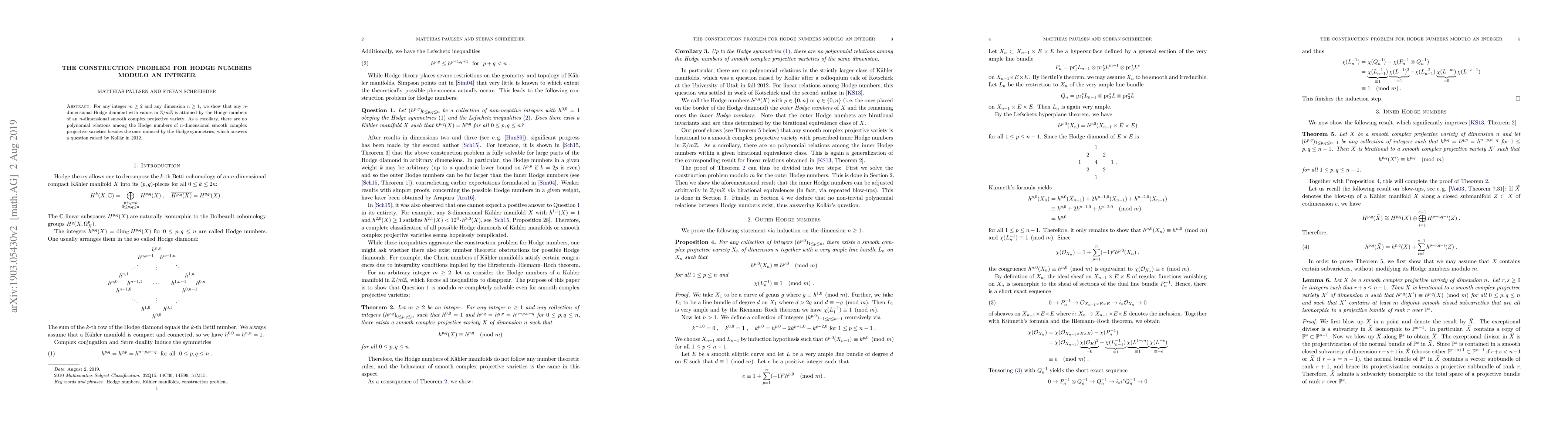 This paper demonstrates that any n-dimensional Hodge diamond with integer values modulo m can be realized by Hodge numbers of a smooth complex projective variety, and it resolves a question by Kollár regarding the absence of polynomial relations among these Hodge numbers beyond those from Hodge symmetries.