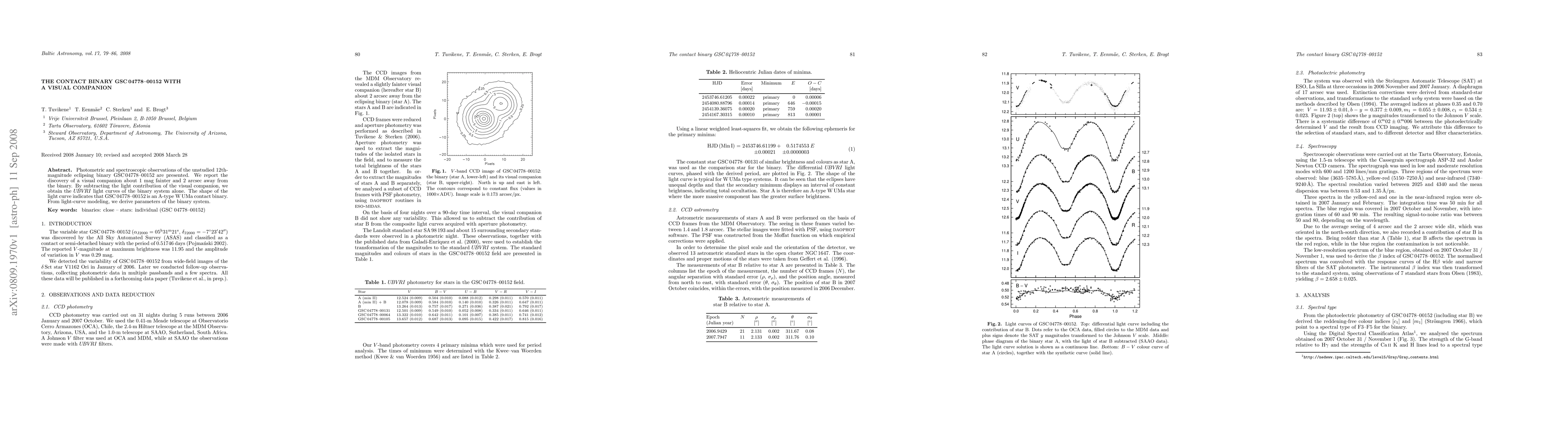 Photometric and spectroscopic observations of the unstudied 12th-magnitude eclipsing binary GSC 04778-00152 are presented. We report the discovery of a visual companion about 1 mag fainter and 2 arcsec away from the binary. By subtracting the light contribution of the visual companion, we obtain the UBVRI light curves of the binary system alone. The shape of the light curve indicates that GSC 04778-00152 is an A-type W UMa contact binary. From light-curve modeling, we derive parameters of the binary system.