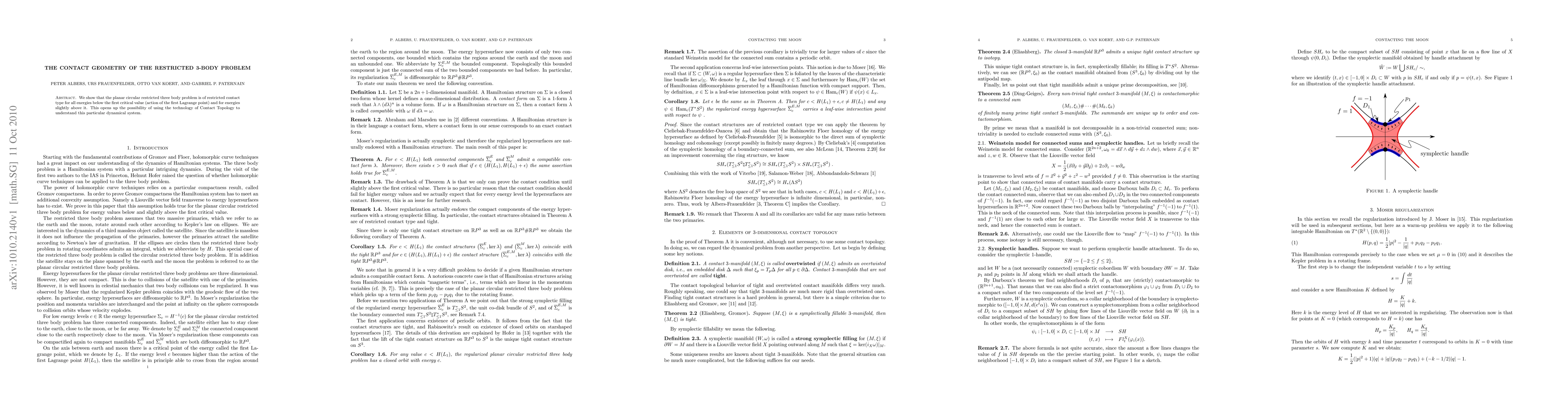 Summary: The paper demonstrates that the planar circular restricted three-body problem exhibits restricted contact geometry for energies below and slightly above the first critical value, enabling the application of Contact Topology to analyze this dynamical system.