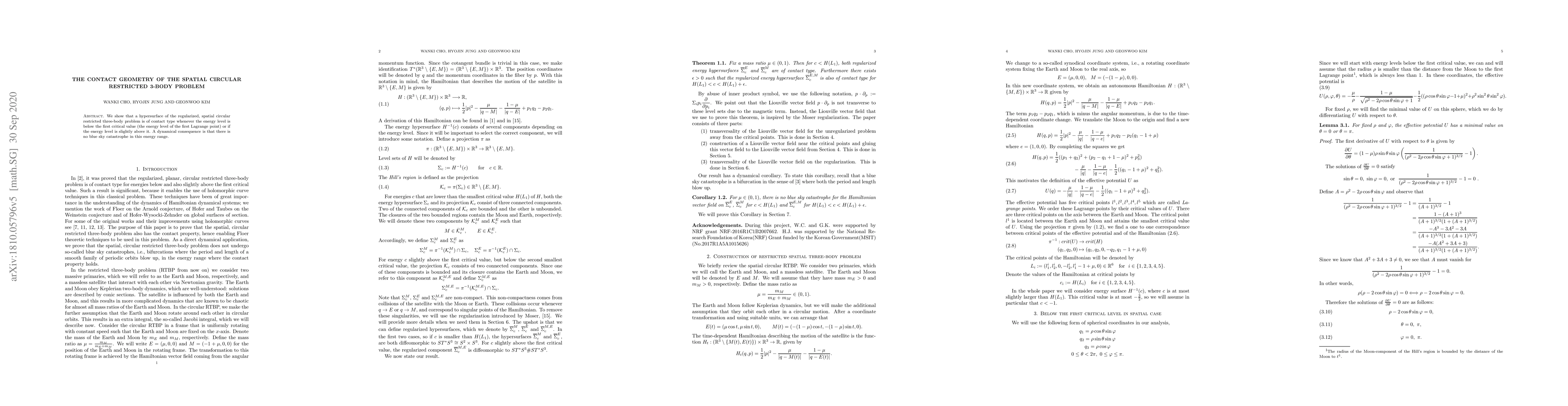 Summary: The study reveals that a hypersurface in the spatial circular restricted three-body problem exhibits contact geometry below the first critical energy level, ensuring no blue sky catastrophe occurs in this energy range.