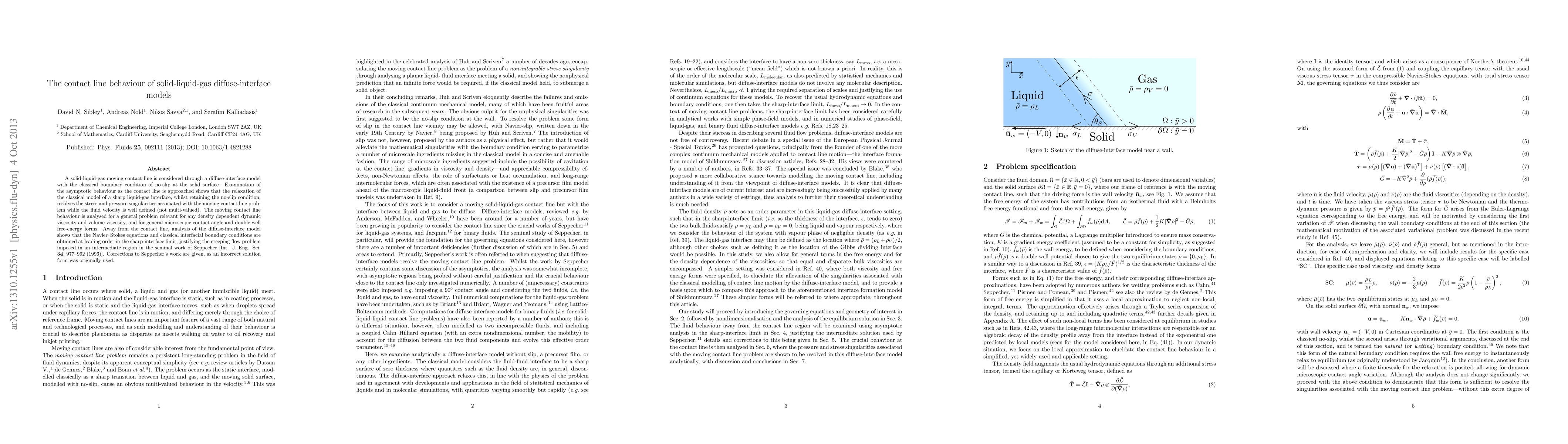 This paper examines the behaviour of a solid-liquid-gas contact line using a diffuse-interface model, resolving stress and pressure singularities while maintaining a well-defined fluid velocity. It corrects prior work by demonstrating that the diffuse-interface approach leads to Navier-Stokes equations and classical boundary conditions in the sharp-interface limit.