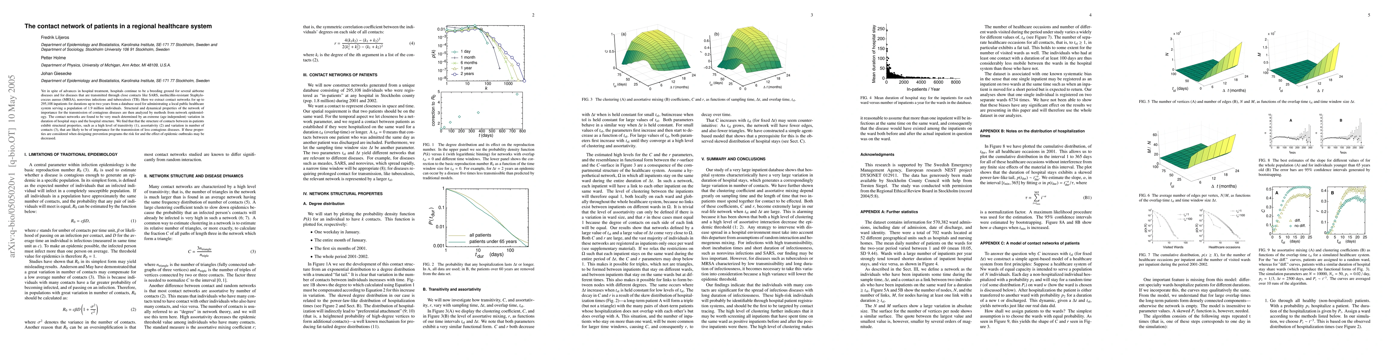 Yet in spite of advances in hospital treatment, hospitals continue to be a breeding ground for several airborne diseases and for diseases that are transmitted through close contacts like SARS, methicillin-resistant Staphylococcus aureus (MRSA), norovirus infections and tuberculosis (TB). Here we extract contact networks for up to 295,108 inpatients for durations up to two years from a database used for administrating a local public healthcare system serving a population of 1.9 million individuals. Structural and dynamical properties of the network of importance for the transmission of contagious diseases are then analyzed by methods from network epidemiology. The contact networks are found to be very much determined by an extreme (age independent) variation in duration of hospital stays and the hospital structure. We find that that the structure of contacts between in-patients exhibit structural properties, such as a high level of transitivity, assortativity and variation in number of contacts, that are likely to be of importance for the transmission of less contagious diseases. If these properties are considered when designing prevention programs the risk for and the effect of epidemic outbreaks may be decreased.