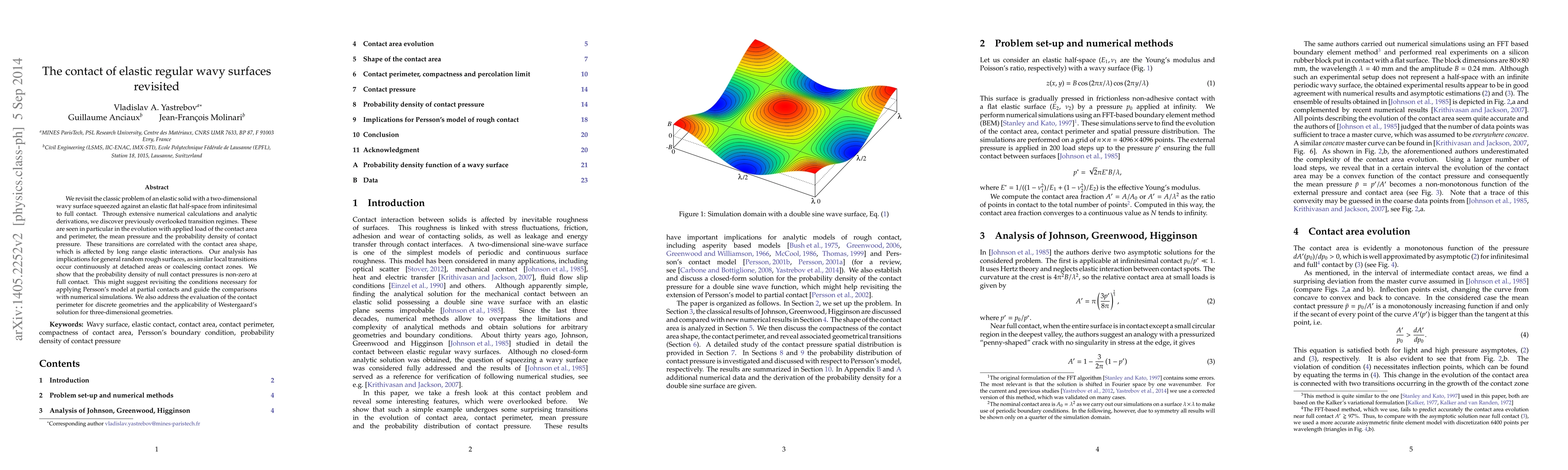 We revisit the classic problem of an elastic solid with a two-dimensional wavy surface squeezed against an elastic flat half-space from infinitesimal to full contact. Through extensive numerical calculations and analytic derivations, we discover previously overlooked transition regimes. These are seen in particular in the evolution with applied load of the contact area and perimeter, the mean pressure and the probability density of contact pressure. These transitions are correlated with the contact area shape, which is affected by long range elastic interactions. Our analysis has implications for general random rough surfaces, as similar local transitions occur continuously at detached areas or coalescing contact zones. We show that the probability density of null contact pressures is non-zero at full contact. This might suggest revisiting the conditions necessary for applying Persson's model at partial contacts and guide the comparisons with numerical simulations. We also address the evaluation of the contact perimeter for discrete geometries and the applicability of Westergaard's solution for three-dimensional geometries.