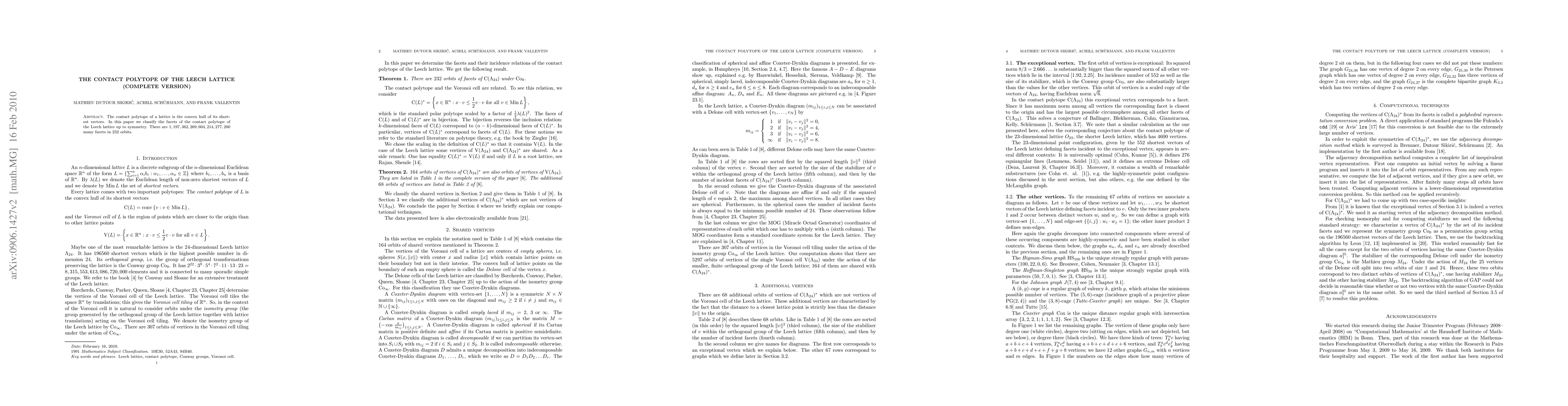 This paper classifies the facets of the contact polytope of the Leech lattice, determining that there are 1,197,362,269,604,214,277,200 facets organized into 232 orbits under symmetry. The contact polytope is defined as the convex hull of the shortest vectors of the lattice.