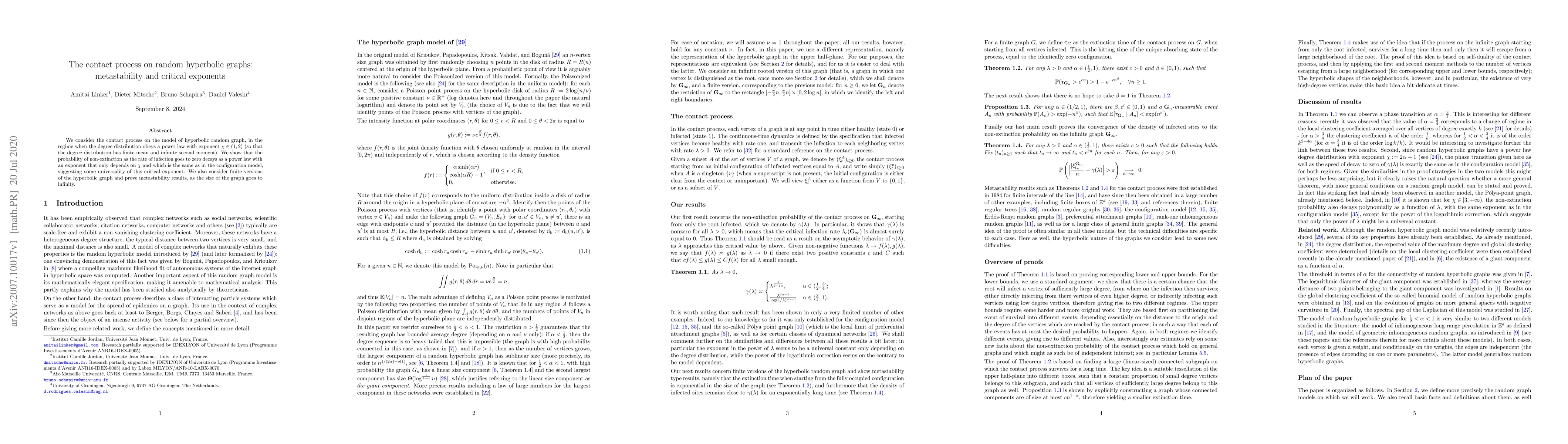 The contact process on random hyperbolic graphs shows universality in critical exponents for non-extinction probability, with a decay rate depending only on the graph's degree distribution exponent χ.