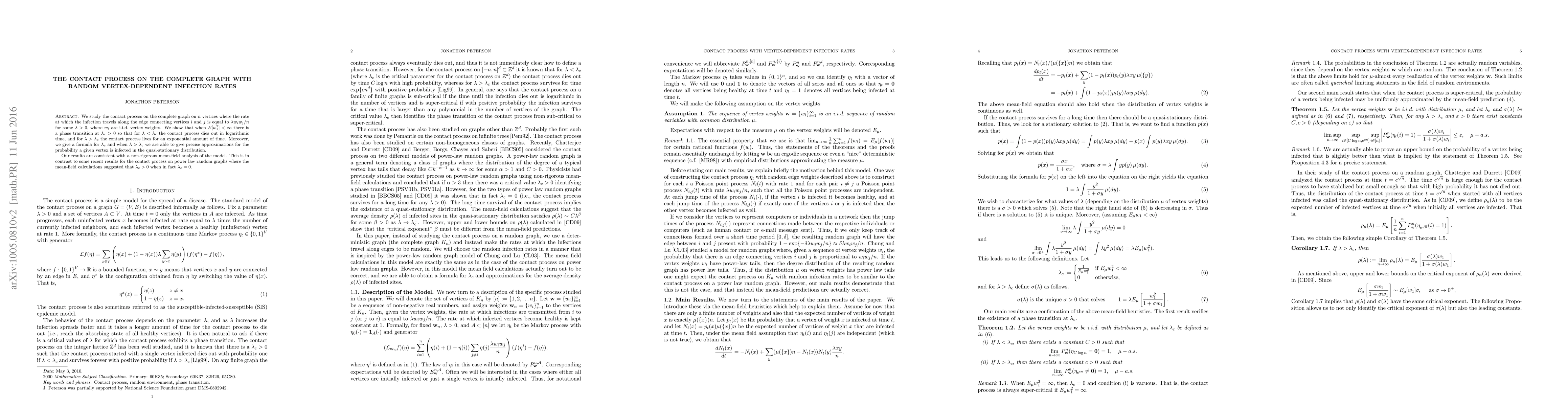 This paper investigates the contact process on a complete graph with random vertex-dependent infection rates, demonstrating a phase transition at a critical value $\lambda_c$ where the infection either dies out or persists indefinitely based on $\lambda$'s relation to $\lambda_c$. The study provides a formula for $\lambda_c$ and precise approximations for infection probabilities in the quasi-stationary phase.