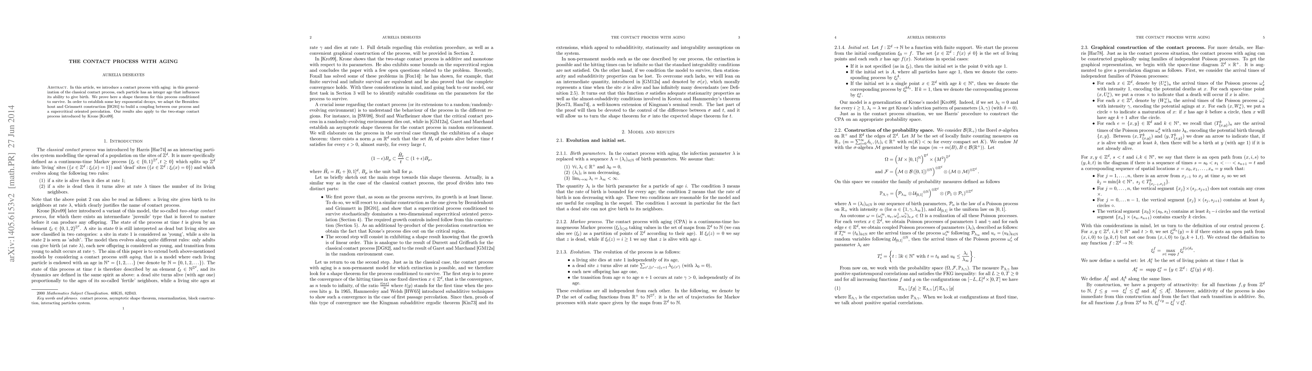 This paper generalizes the classical contact process by introducing aging for particles, affecting their birth rates. The authors prove a shape theorem for the conditioned surviving process and utilize a coupling method with supercritical oriented percolation to establish exponential decay results, extending their findings to the two-stage contact process.