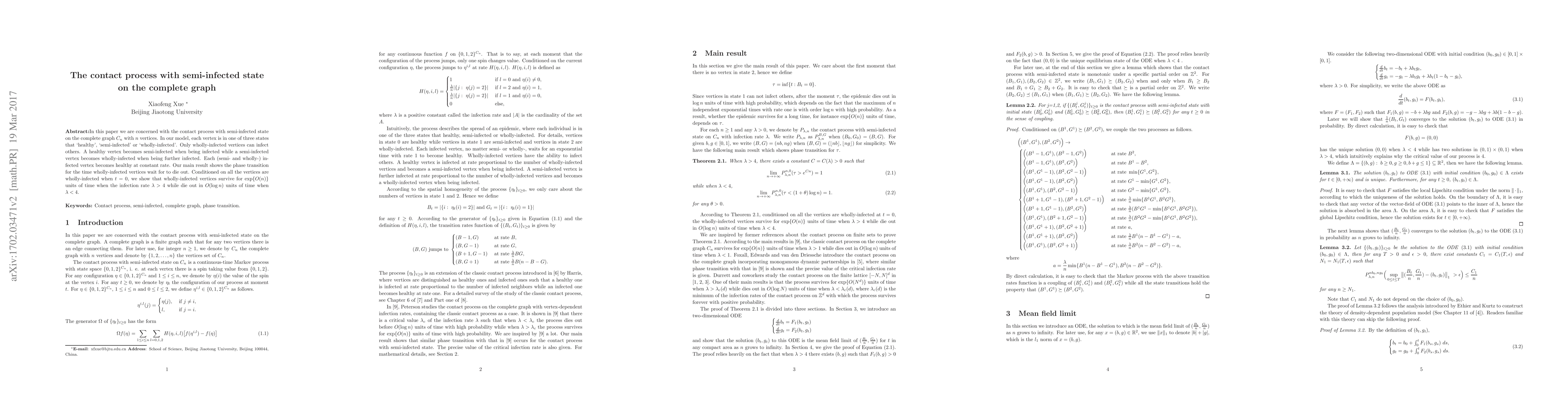 This paper studies the contact process on a complete graph where vertices can be healthy, semi-infected, or wholly-infected, with only the latter capable of infecting others. It demonstrates a phase transition in the survival time of wholly-infected vertices, showing they survive for $\exp\{O(n)\}$ time units when the infection rate $\lambda > 4$ and die out in $O(\log n)$ time units when $\lambda < 4$.
