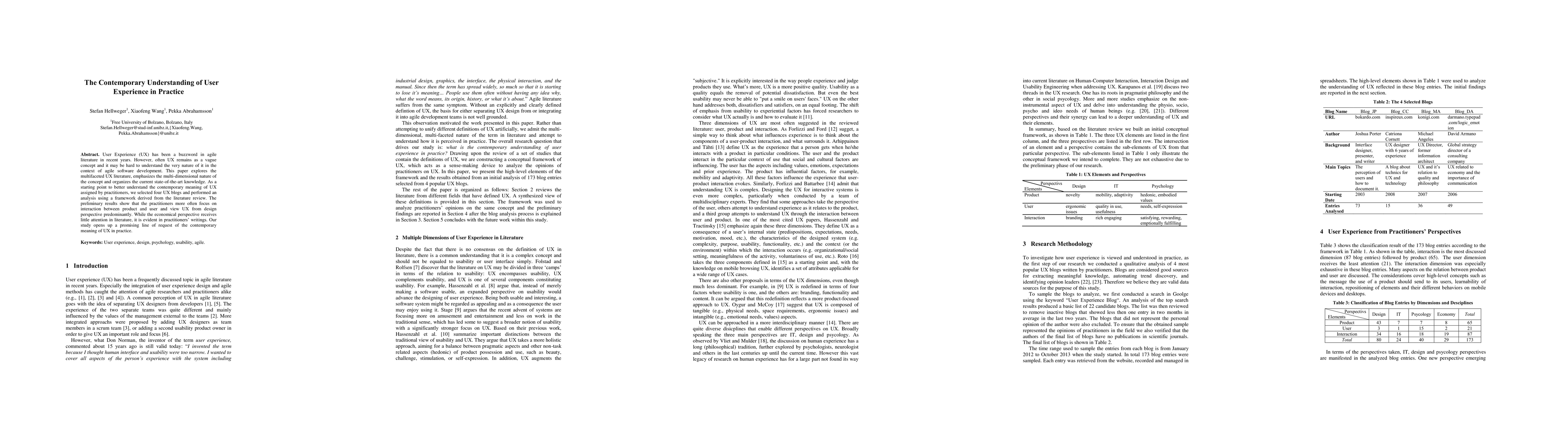 A study analyzed UX blogs to understand practitioners' contemporary understanding of user experience in agile software development. It found that practitioners focus on product-user interaction and design perspective, with economic aspects receiving less attention.