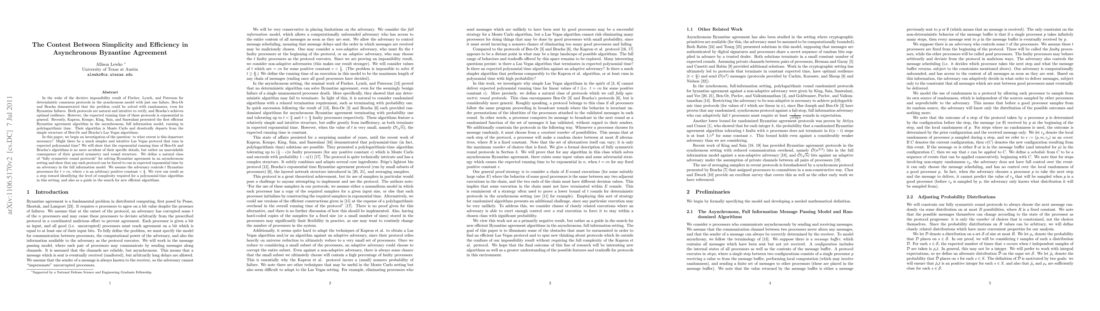 In the wake of the decisive impossibility result of Fischer, Lynch, and Paterson for deterministic consensus protocols in the aynchronous model with just one failure, Ben-Or and Bracha demonstrated that the problem could be solved with randomness, even for Byzantine failures. Both protocols are natural and intuitive to verify, and Bracha's achieves optimal resilience. However, the expected running time of these protocols is exponential in general. Recently, Kapron, Kempe, King, Saia, and Sanwalani presented the first efficient Byzantine agreement algorithm in the asynchronous, full information model, running in polylogarithmic time. Their algorithm is Monte Carlo and drastically departs from the simple structure of Ben-Or and Bracha's Las Vegas algorithms. In this paper, we begin an investigation of the question: to what extent is this departure necessary? Might there be a much simpler and intuitive Las Vegas protocol that runs in expected polynomial time? We will show that the exponential running time of Ben-Or and Bracha's algorithms is no mere accident of their specific details, but rather an unavoidable consequence of their general symmetry and round structure. We define a natural class of "fully symmetric round protocols" for solving Byzantine agreement in an asynchronous setting and show that any such protocol can be forced to run in expected exponential time by an adversary in the full information model. We assume the adversary controls $t$ Byzantine processors for $t = cn$, where $c$ is an arbitrary positive constant $< 1/3$. We view our result as a step toward identifying the level of complexity required for a polynomial-time algorithm in this setting, and also as a guide in the search for new efficient algorithms.