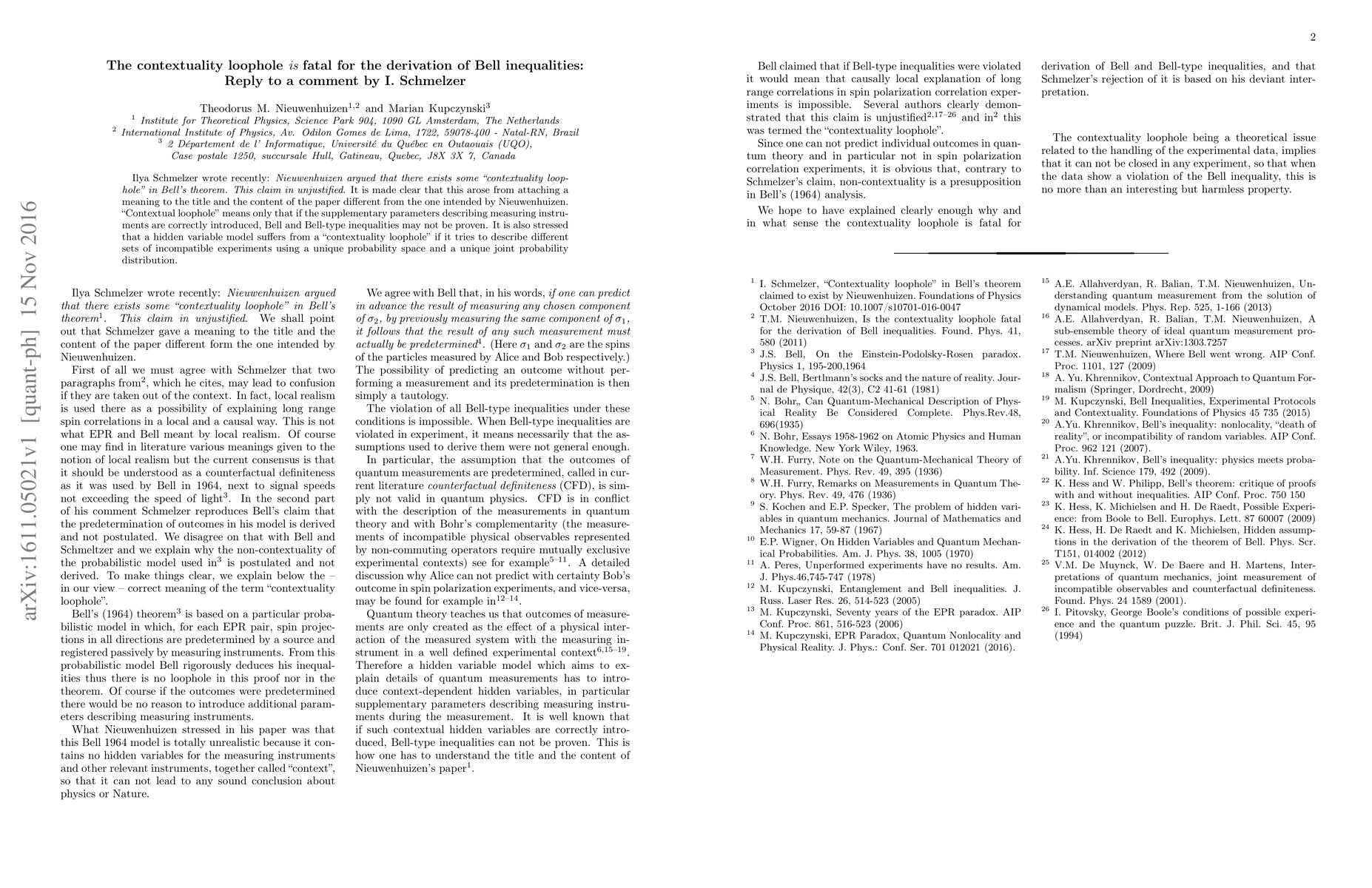 Ilya Schmelzer wrote recently: {\it Nieuwenhuizen argued that there exists some "contextuality loophole" in Bell's theorem. This claim in unjustified}. It is made clear that this arose from attaching a meaning to the title and the content of the paper different from the one intended by Nieuwenhuizen. "Contextual loophole" means only that if the supplementary parameters describing measuring instruments are correctly introduced, Bell and Bell-type inequalities may not be proven. It is also stressed that a hidden variable model suffers from a "contextuality loophole" if it tries to describe different sets of incompatible experiments using a unique probability space and a unique joint probability distribution.