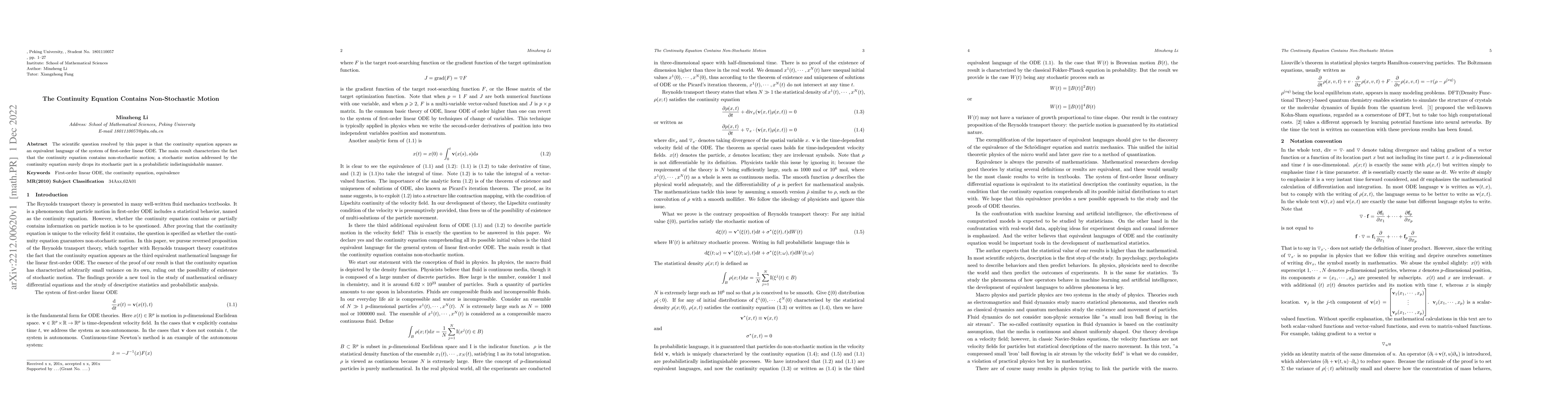 The scientific question resolved by this paper is that the continuity equation appears as an equivalent language of the system of first-order linear ODE. The main result characterizes the fact that the continuity equation contains non-stochastic motion; a stochastic motion addressed by the continuity equation surely drops its stochastic part in a probabilistic indistinguishable manner.