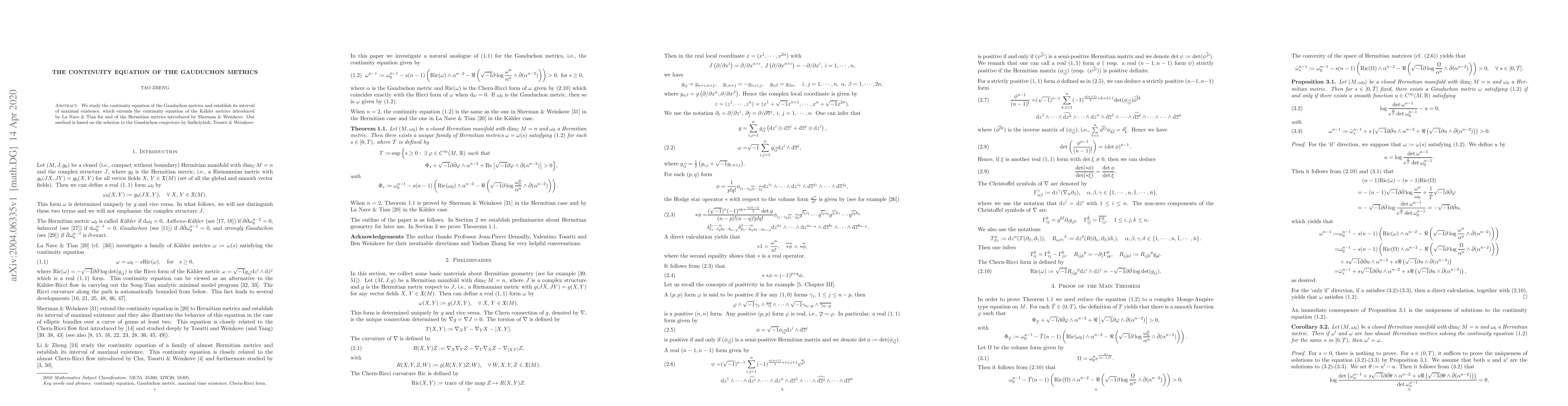 This paper studies the continuity equation of the Gauduchon metrics, extending previous work on K"ahler and Hermitian metrics, and establishes its interval of maximal existence.