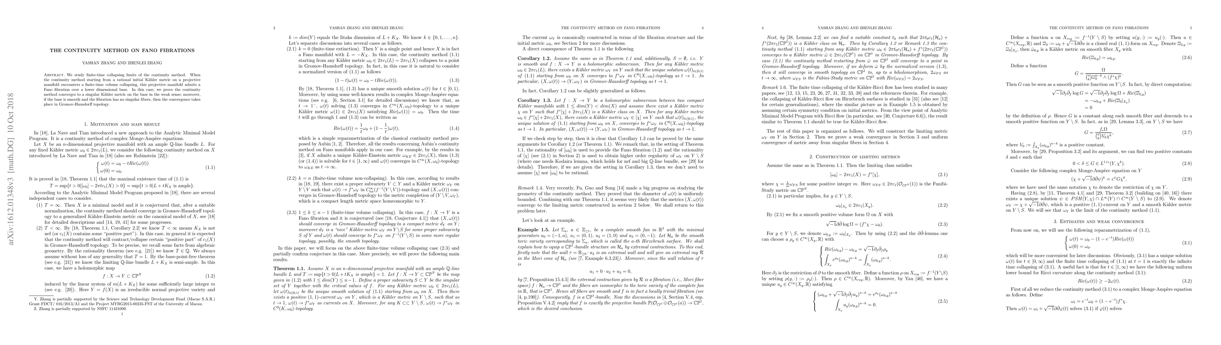 We study finite-time collapsing limits of the continuity method. When the continuity method starting from a rational initial K\"ahler metric on a projective manifold encounters a finite-time volume collapsing, this projective manifold admits a Fano fibration over a lower dimensional base. In this case, we prove the continuity method converges to a singular K\"ahler metric on the base in the weak sense; moreover, if the base is smooth and the fibration has no singular fibers, then the convergence takes place in Gromov-Hausdorff topology.