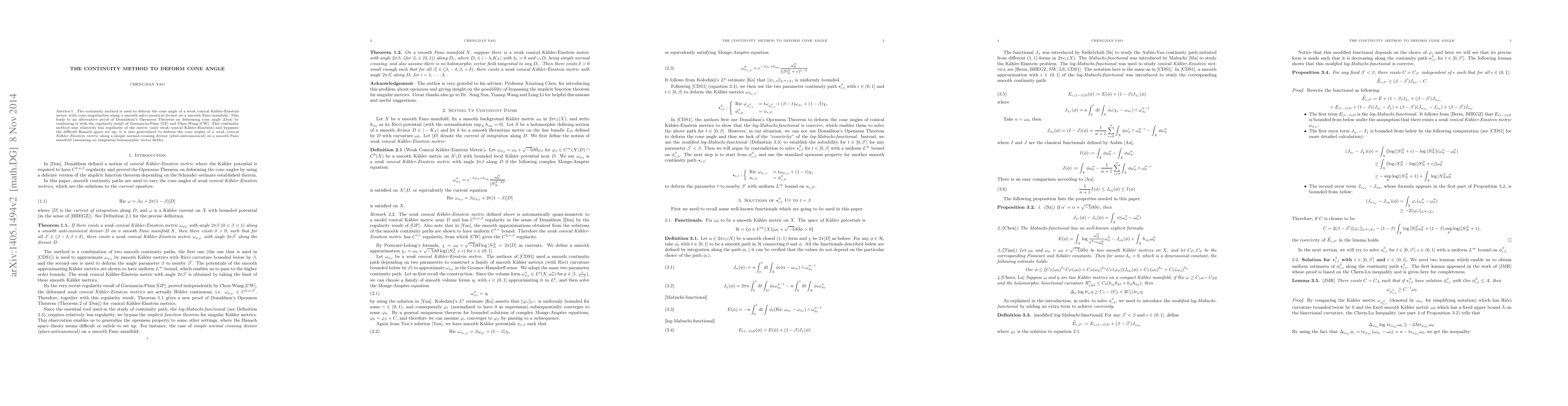 Summary: The continuity method is applied to deform the cone angle of weak conical Kähler-Einstein metrics along divisors on smooth Fano manifolds, providing an alternative proof of Donaldson's Openness Theorem and generalizing to simple normal crossing divisors, with minimal metric regularity requirements.