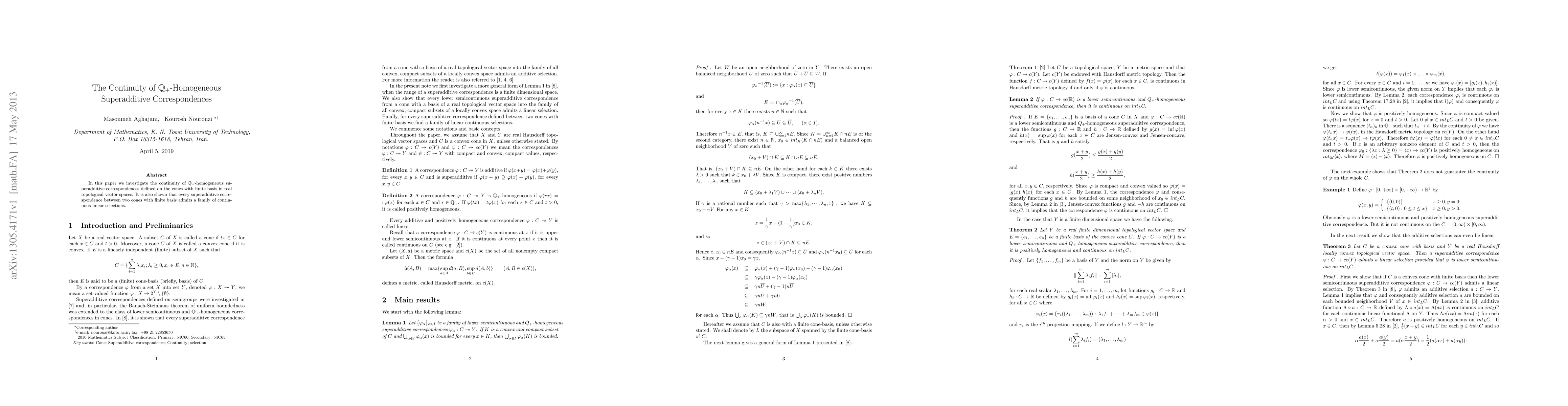 In this paper we investigate the continuity of $\mathbb{Q}_+$-homogeneous superadditive correspondences defined on the cones with finite basis in real topological vector spaces. It is also shown that every lower semicontinuous and $\mathbb{Q}_+$-homogeneous superadditive correspondence between two cones with finite basis admits a family of continuous linear selections.