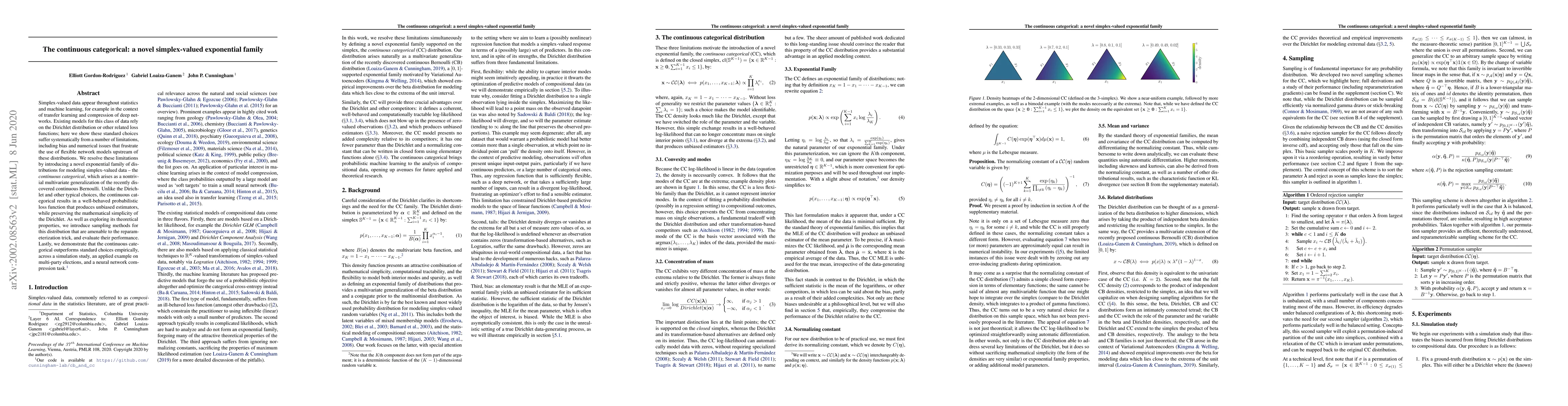 This paper introduces the continuous categorical, a new simplex-valued exponential family distribution that addresses limitations of existing models like the Dirichlet distribution. It outperforms standard choices in terms of unbiased estimation and numerical stability, and demonstrates superior performance in simulations, election data analysis, and neural network compression.