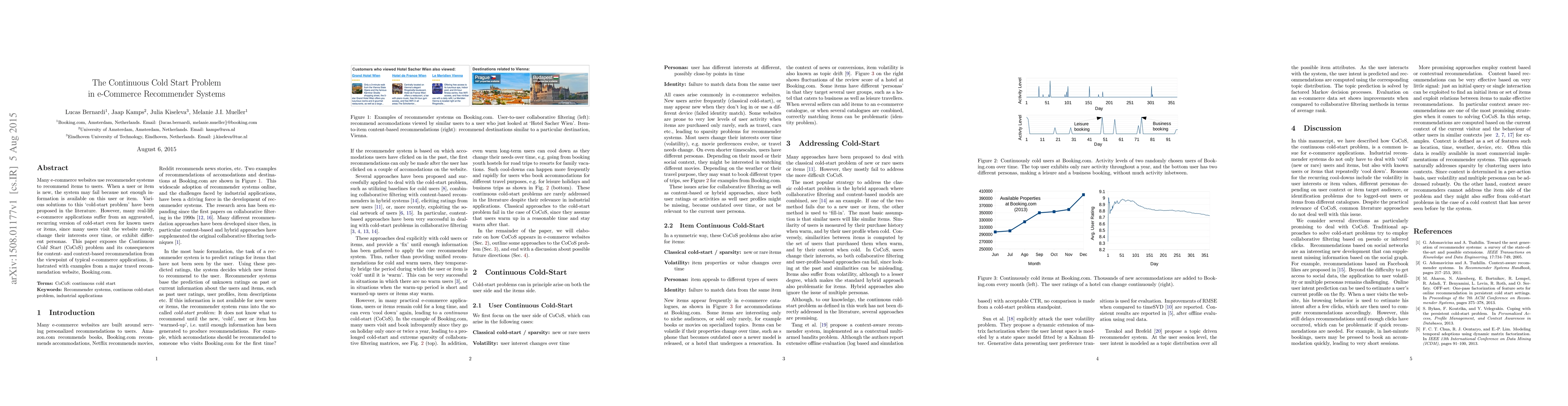 The paper discusses the Continuous Cold Start (CoCoS) problem in e-commerce recommender systems, illustrated with examples from Booking.com. It examines how CoCoS arises from user and item volatility, personas, and identity issues, and how traditional cold-start solutions fail to address this recurring problem.