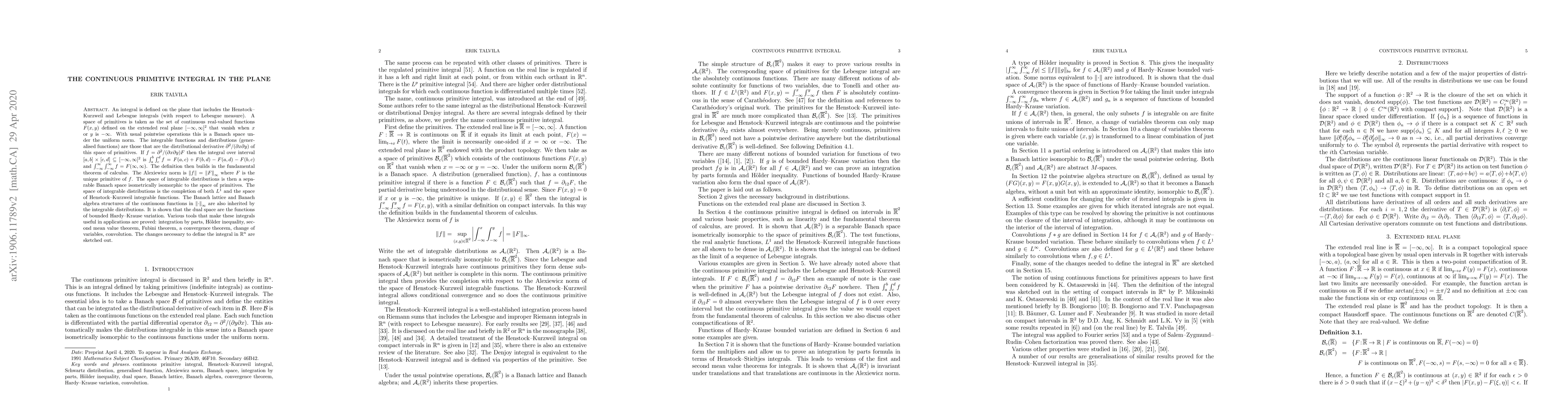 An integral is defined on the plane that includes the Henstock--Kurzweil and Lebesgue integrals (with respect to Lebesgue measure). A space of primitives is taken as the set of continuous real-valued functions $F(x,y)$ defined on the extended real plane $[-\infty,\infty]^2$ that vanish when $x$ or $y$ is $-\infty$. With usual pointwise operations this is a Banach space under the uniform norm. The integrable functions and distributions (generalised functions) are those that are the distributional derivative $\partial^2/(\partial x\partial y)$ of this space of primitives. If $f=\partial^2/(\partial x\partial y) F$ then the integral over interval $[a,b]\times [c,d] \subseteq[-\infty,\infty]^2$ is $\int_a^b\int_c^d f=F(a,c)+F(b,d)-F(a,d)-F(b,c)$ and $\int_{-\infty}^\infty \int_{-\infty}^\infty f=F(\infty,\infty)$. The definition then builds in the fundamental theorem of calculus. The Alexiewicz norm is ${\lVert f\rVert}={\lVert F\rVert}_\infty$ where $F$ is the unique primitive of $f$. The space of integrable distributions is then a separable Banach space isometrically isomorphic to the space of primitives. The space of integrable distributions is the completion of both $L^1$ and the space of Henstock--Kurzweil integrable functions. The Banach lattice and Banach algebra structures of the continuous functions in ${\lVert \cdot\rVert}_\infty$ are also inherited by the integrable distributions. It is shown that the dual space are the functions of bounded Hardy--Krause variation. Various tools that make these integrals useful in applications are proved: integration by parts, H\"older inequality, second mean value theorem, Fubini theorem, a convergence theorem, change of variables, convolution. The changes necessary to define the integral in ${\mathbb R}^n$ are sketched out.