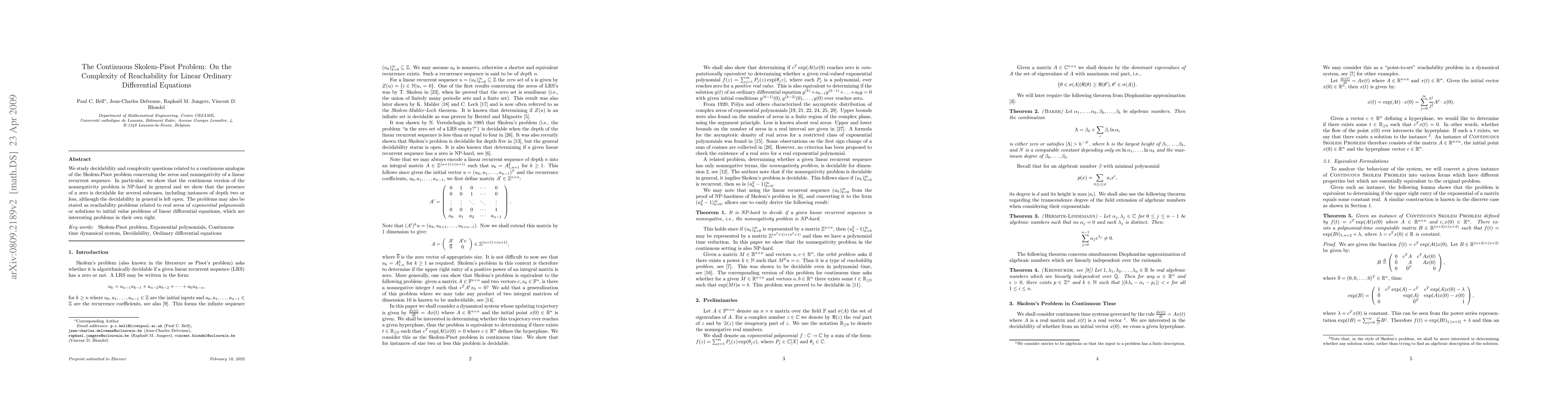 We study decidability and complexity questions related to a continuous analogue of the Skolem-Pisot problem concerning the zeros and nonnegativity of a linear recurrent sequence. In particular, we show that the continuous version of the nonnegativity problem is NP-hard in general and we show that the presence of a zero is decidable for several subcases, including instances of depth two or less, although the decidability in general is left open. The problems may also be stated as reachability problems related to real zeros of exponential polynomials or solutions to initial value problems of linear differential equations, which are interesting problems in their own right.