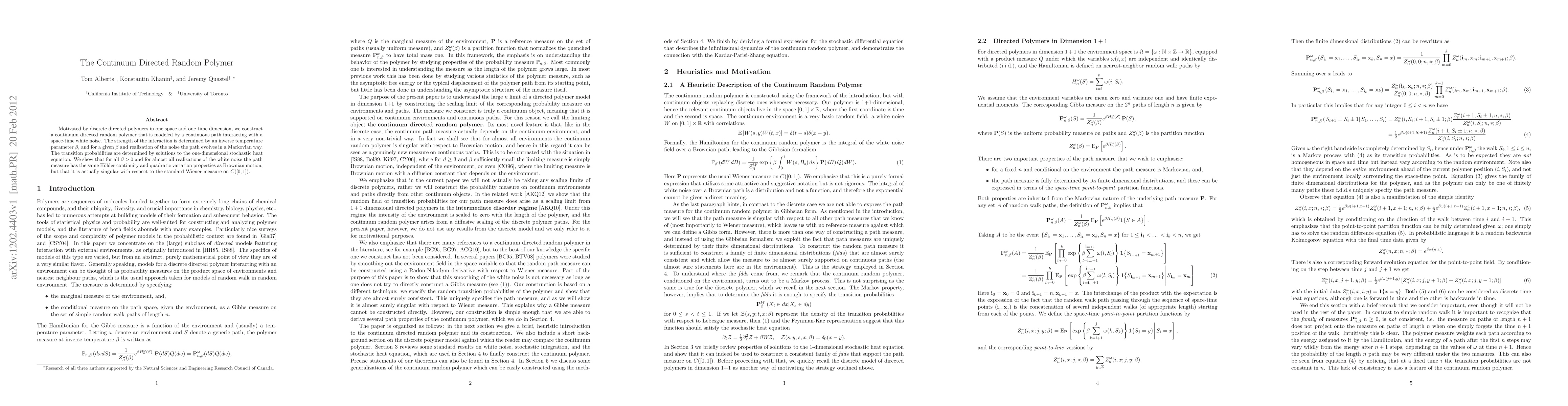 This paper constructs a continuum directed random polymer modeled by a continuous path interacting with space-time white noise, showing it exhibits Holder continuity and quadratic variation akin to Brownian motion, despite being singular with respect to standard Wiener measure. The path's evolution follows the one-dimensional stochastic heat equation.