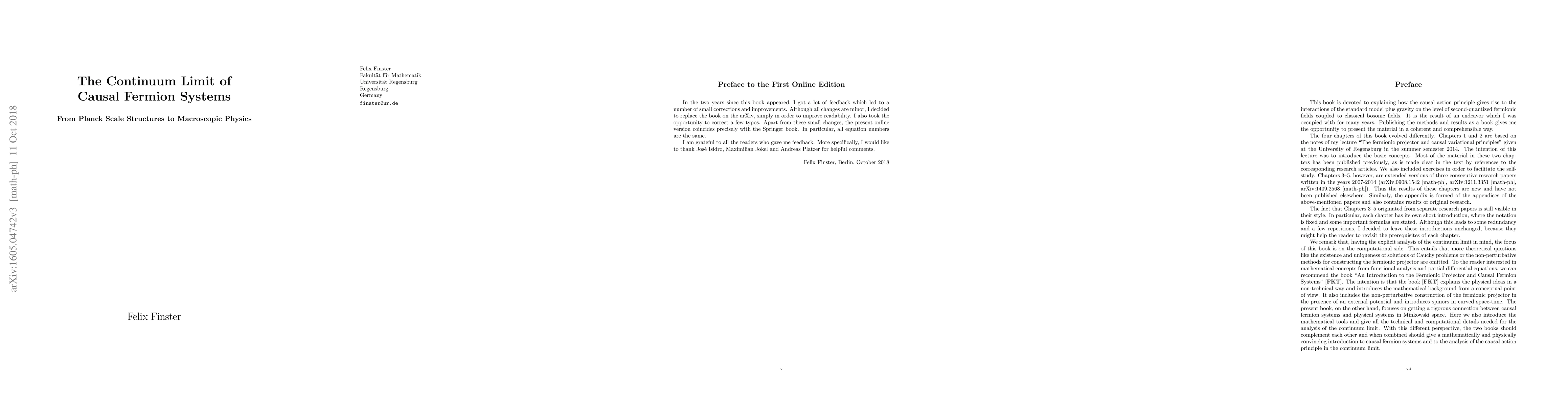 This monograph explores the theory of causal fermion systems, presenting a unified physical theory that encompasses quantum mechanics, general relativity, and quantum field theory. It emphasizes the causal action principle and its mathematical framework for describing non-smooth geometries and interactions of the standard model plus gravity.