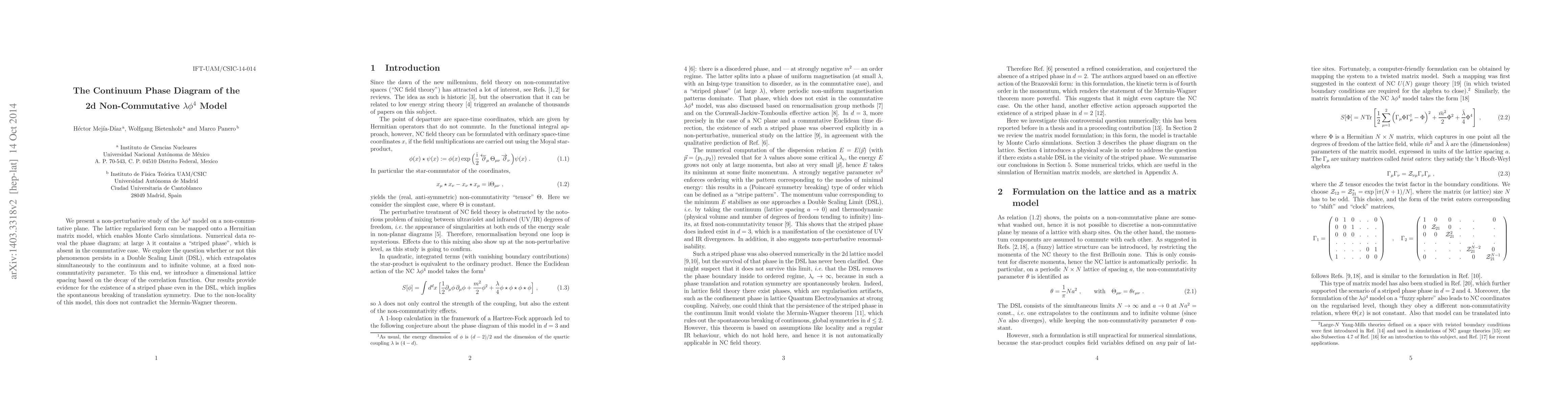 This paper investigates the continuum phase diagram of a 2D non-commutative λϕ^4 model, revealing a "striped phase" at large λ that persists even in the Double Scaling Limit, indicating spontaneous symmetry breaking. The non-locality of the model allows this behavior without violating the Mermin-Wagner Theorem.