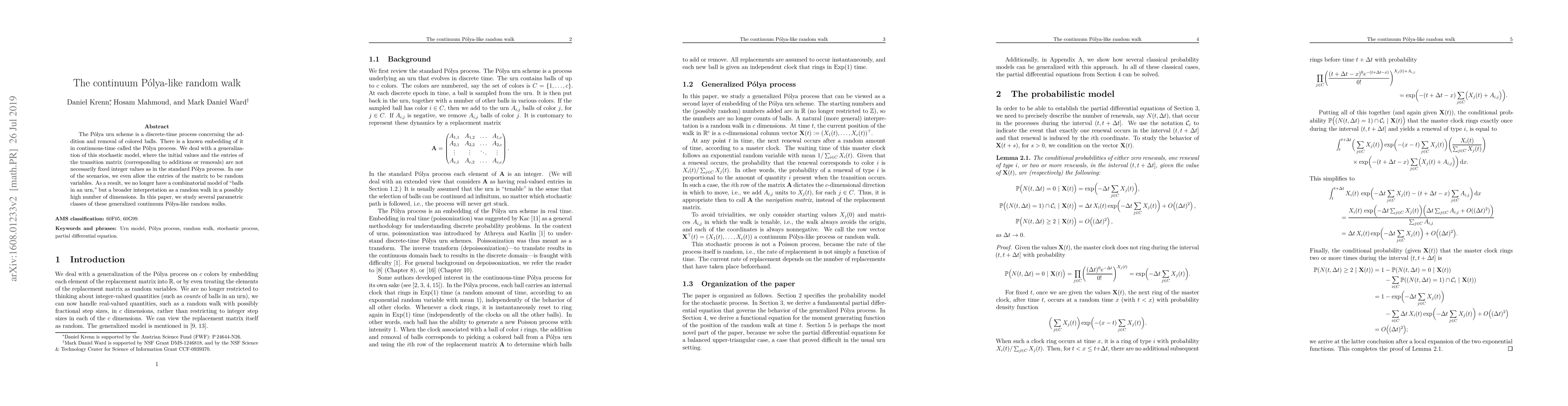 The paper investigates a generalized version of the Pólya process, where initial values and transition matrix entries are not fixed integers, leading to a random walk in potentially high dimensions. It explores several parametric classes of these continuum Pólya-like random walks.