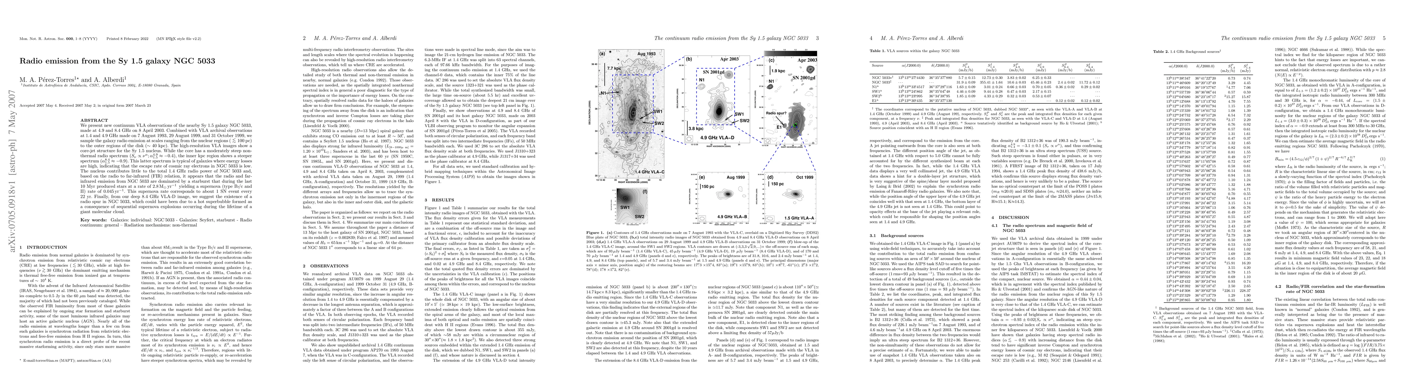We present new continuum VLA observations of the nearby Sy 1.5 galaxy NGC 5033, made at 4.9 and 8.4 GHz on 8 April 2003. Combined with VLA archival observations at 1.4 and 4.9 GHz made on 7 August 1993, 29 August 1999, and 31 October 1999, we sample the galaxy radio emission at scales ranging from the nuclear regions (<~ 100 pc) to the outer regions of the disk (~ 40 kpc). The high-resolution VLA images show a core-jet structure for the Sy 1.5 nucleus. While the core has a moderately steep non-thermal radio spectrum (S_\nu ~ \nu^\alpha; \alpha_{1.5}^{4.9} \approx -0.4), the inner kpc region shows a steeper spectrum (\alpha_{1.5}^{8.4} \approx -0.9). This latter spectrum is typical of galaxies where energy losses are high, indicating that the escape rate of cosmic ray electrons in NGC 5033 is low. The nucleus contributes little to the total 1.4 GHz radio power of NGC 5033 and, based on the radio to far-infrared (FIR) relation, it appears that the radio and far-infrared emission from NGC 5033 are dominated by a starburst that during the last 10 Myr produced stars at a rate of ~2.8 M_sun/yr, yielding a supernova (type Ib/c and II) rate of 0.045 #/yr. This supernova rate corresponds to about 1 SN event every 22 yr. Finally, from our deep 8.4 GHz VLA-D image, we suggest the existence of a radio spur in NGC 5033, which could have been due to a hot superbubble formed as a consequence of sequential supernova explosions occurring during the lifetime of a giant molecular cloud.