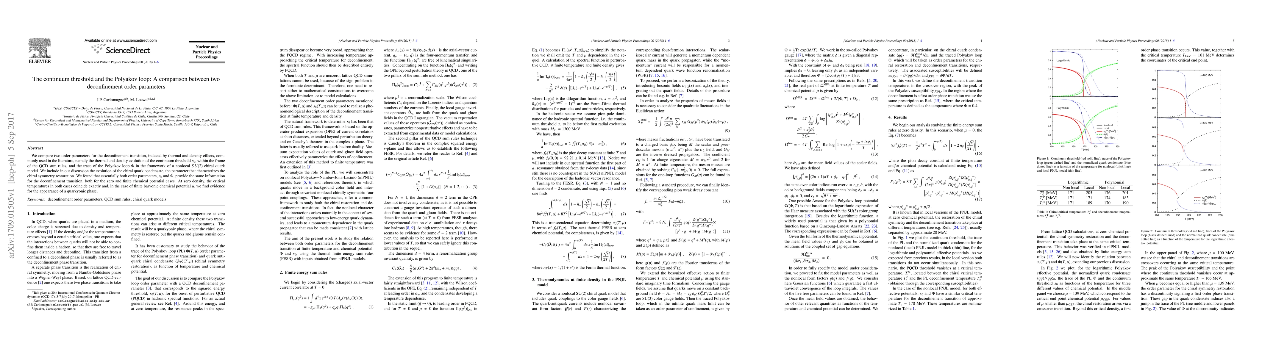 We compare two order parameters for the deconfinement transition, induced by thermal and density effects, commonly used in the literature, namely the thermal and density evolution of the continuum threshold $s_{0}$, within the frame of the QCD sum rules, and the trace of the Polyakov loop $\Phi$ in the framework of a nonlocal $SU(2)$ chiral quark model. We include in our discussion the evolution of the chiral quark condensate, the parameter that characterizes the chiral symmetry restoration. We found that essentially both order parameters, $s_{0}$ and $\Phi$, provide the same information for the deconfinement transition, both for the zero and finite chemical potential cases. At zero density, the critical temperatures in both cases coincide exactly and, in the case of finite baryonic chemical potential $\mu$, we find evidence for the appearance of a quarkyonic phase.